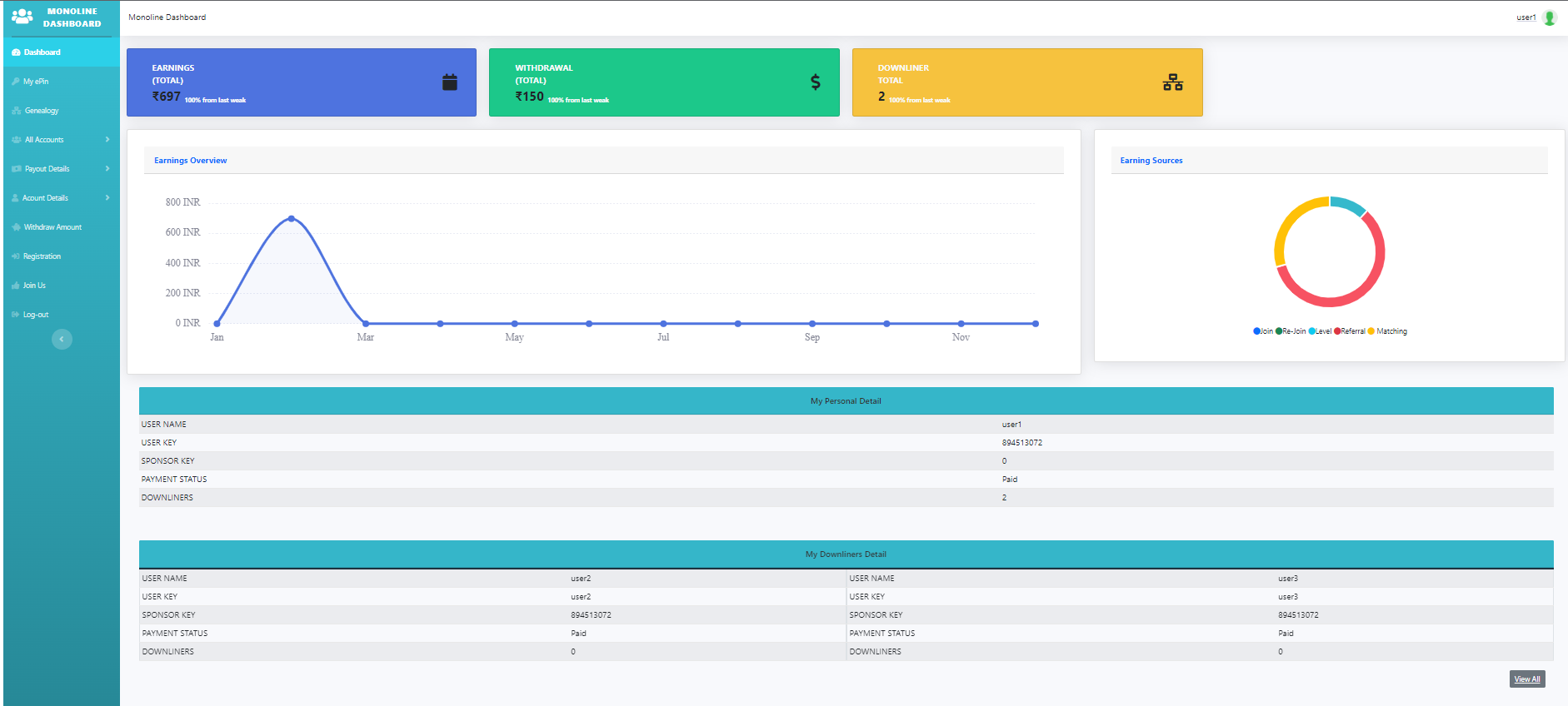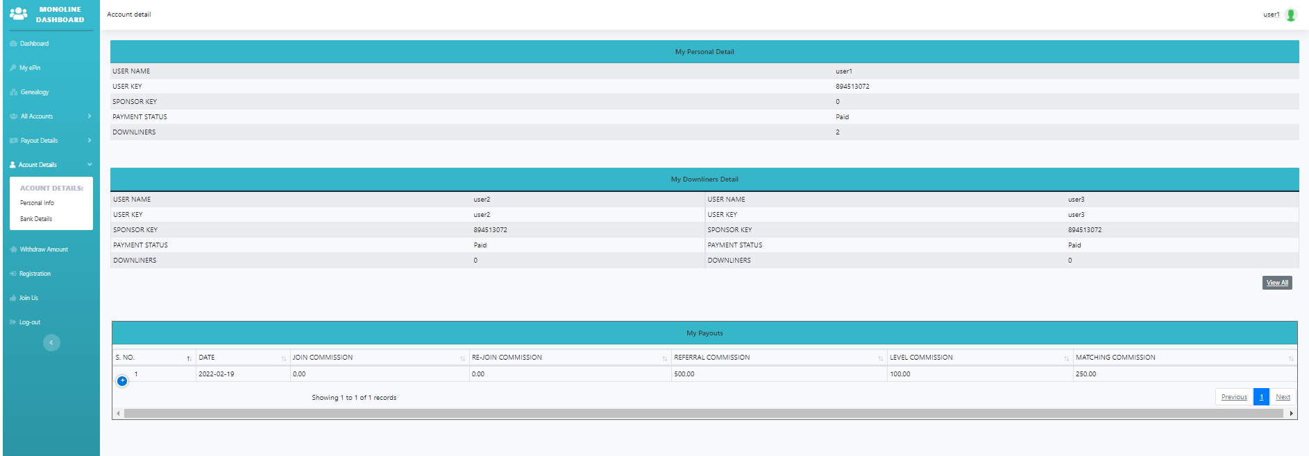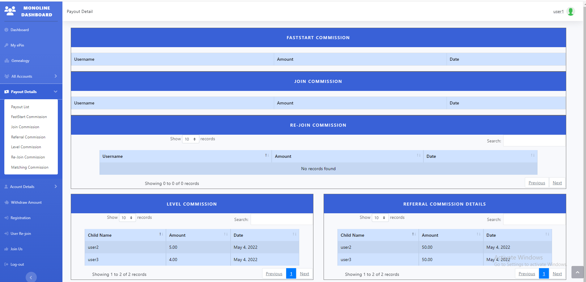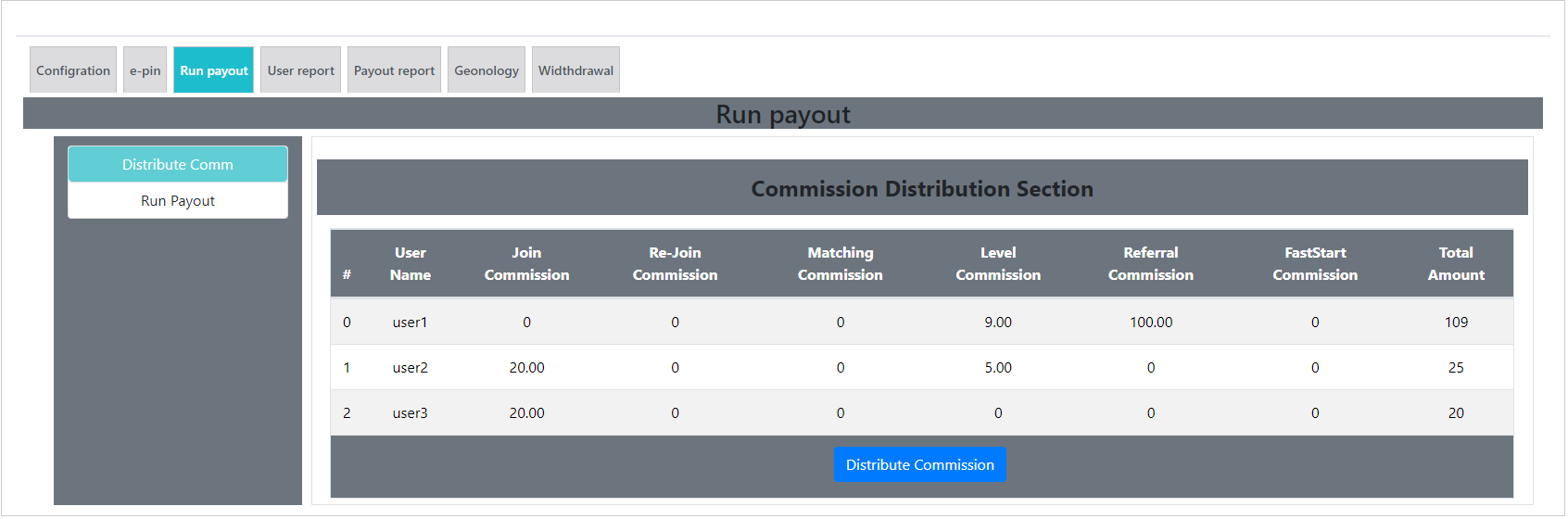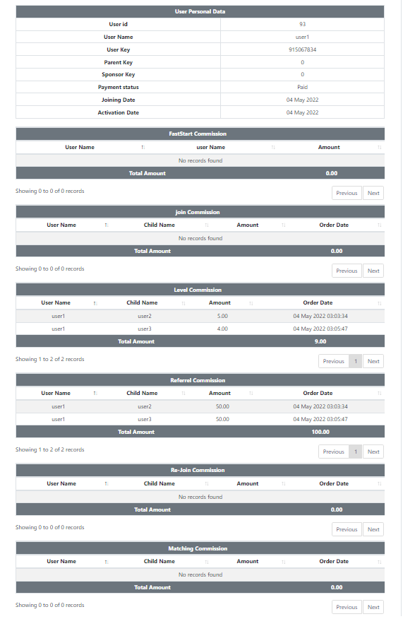 - Re-Join commission : If this user is Re-join then you can see Re-Join commision .