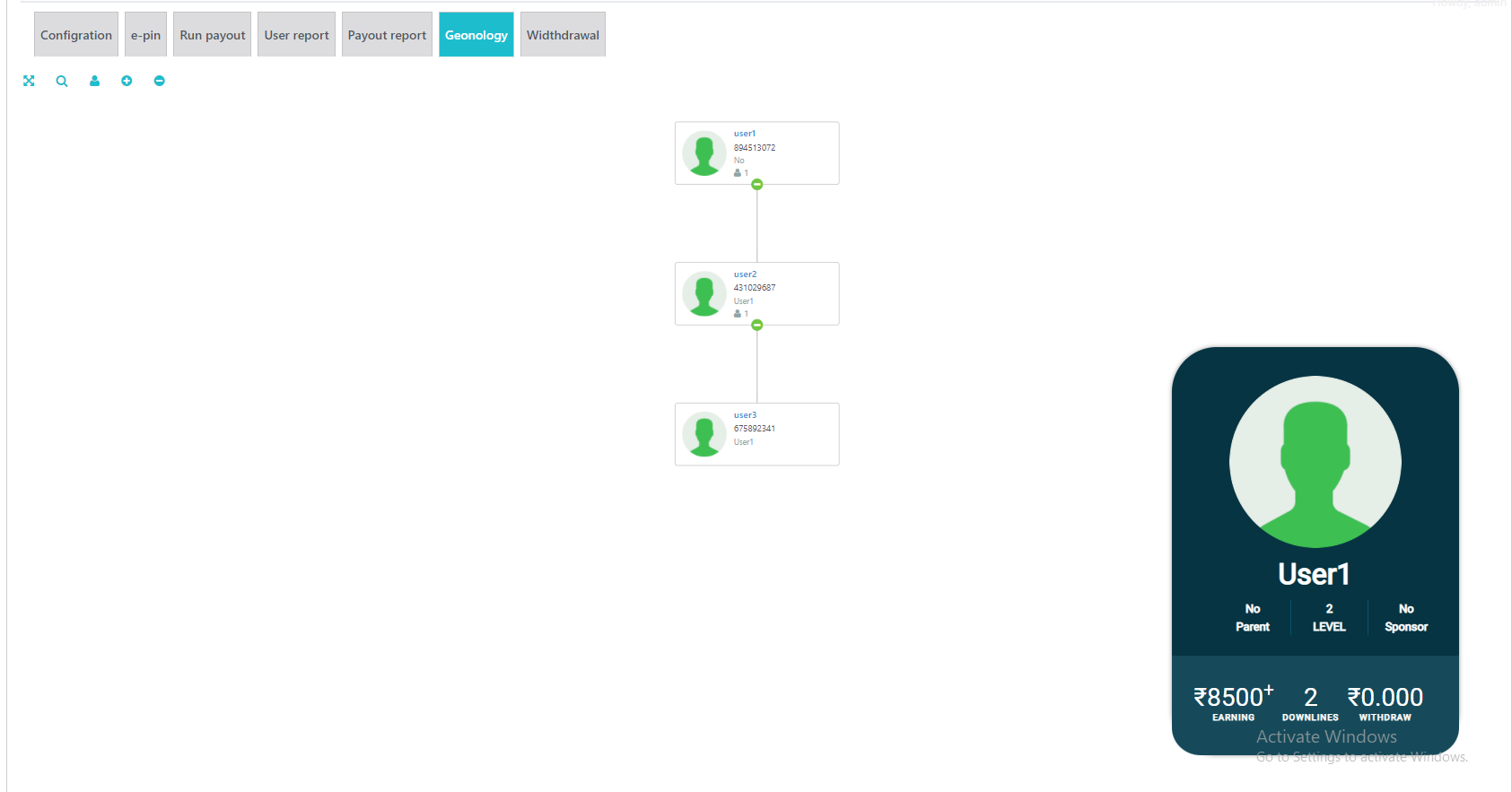 - When Register user 2 & user 3 under user 1 And both Purchase a epin(1000 rs). Lets check commissions and genealogy.