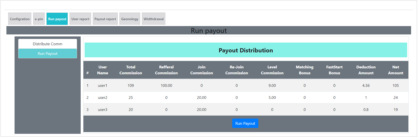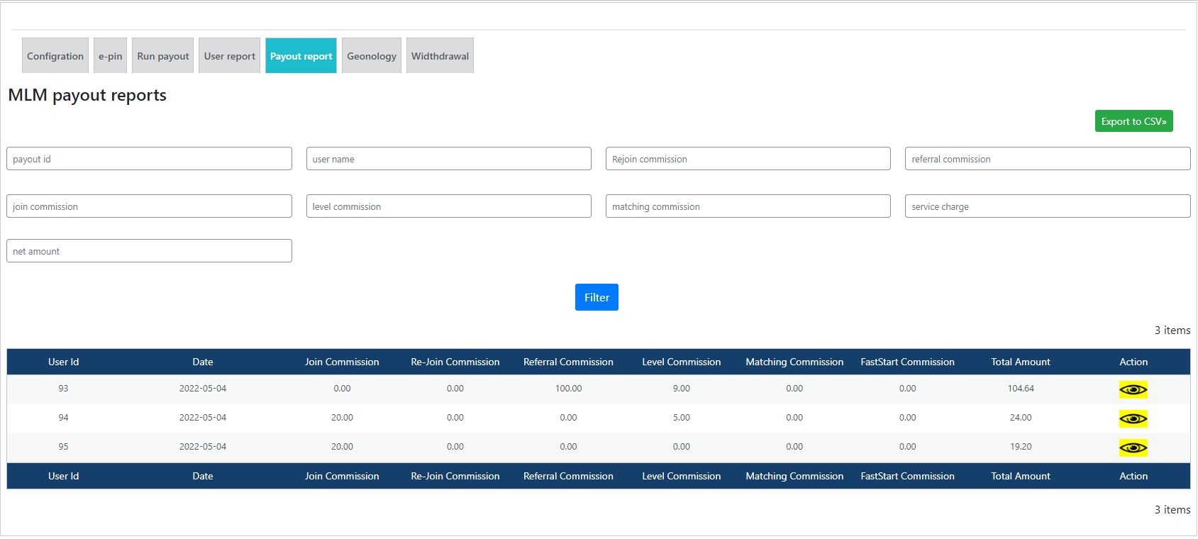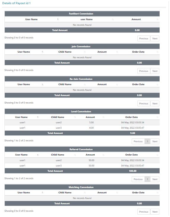 - To view details of payout click on action button, here you will see the user's payouts with their total commissions, bonuses and deductions.