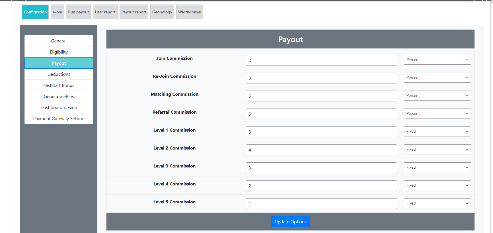- Level 1, Level 2.... --> Level commission depend on general setting -no of level .... fill Level Commision