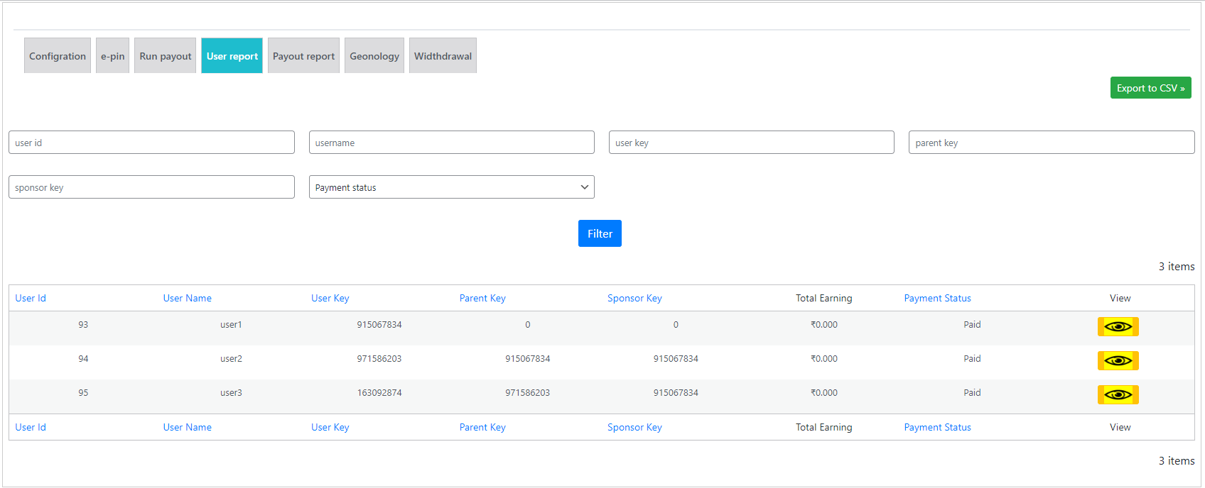 - To view user's payout details click on action button, here you will see complete details of that users payout.