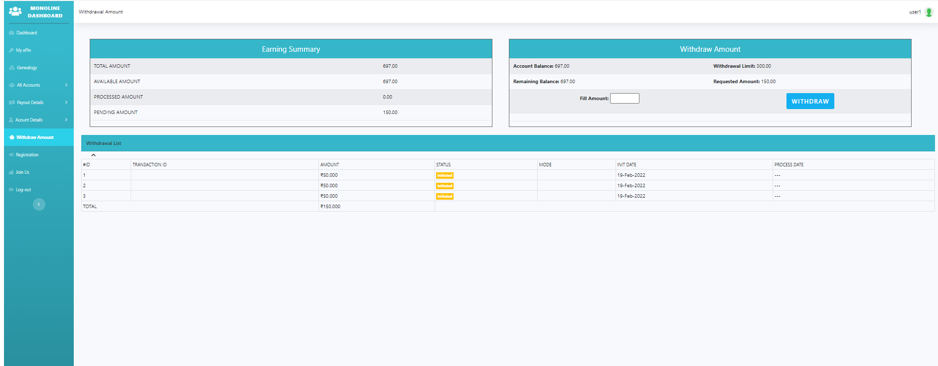 - withdrawal requestHere you will get the all detail of withdrawal request.