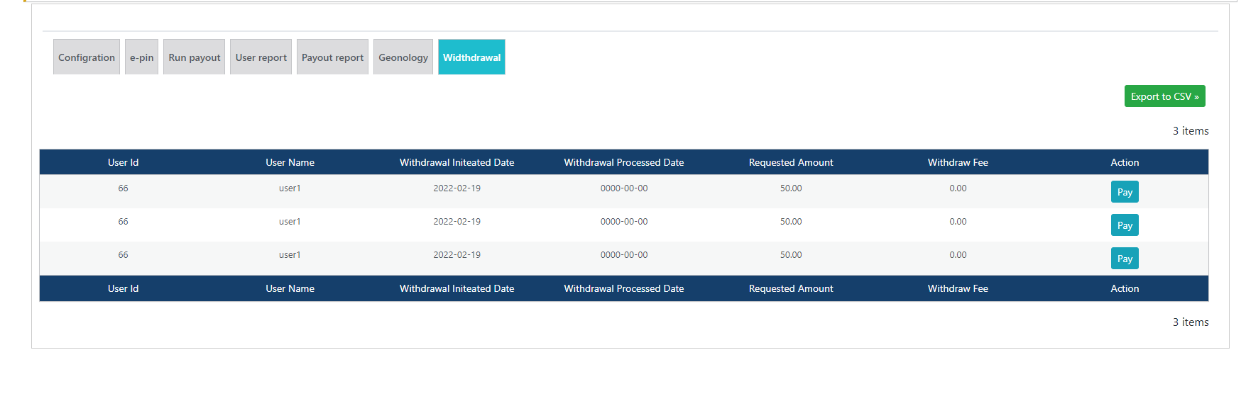 - To view details of witdrawal click on action pay button, here you will see the user's witdrawal requset and you can accept requst and you can see history of witdrawal .