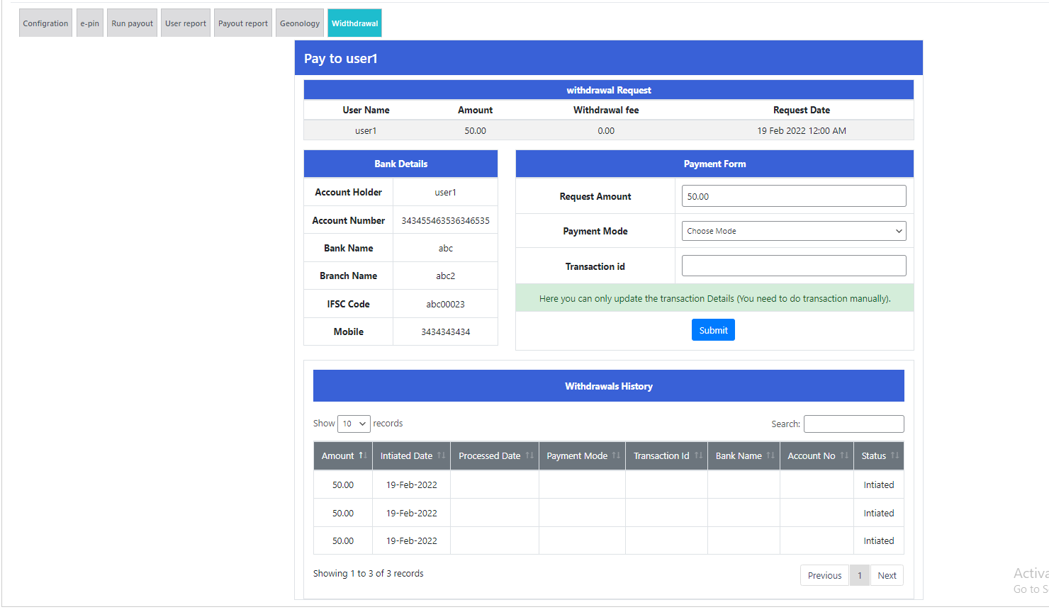- withdrawal historyhere we have history of withdrawal, paid request, process request,initiate request.