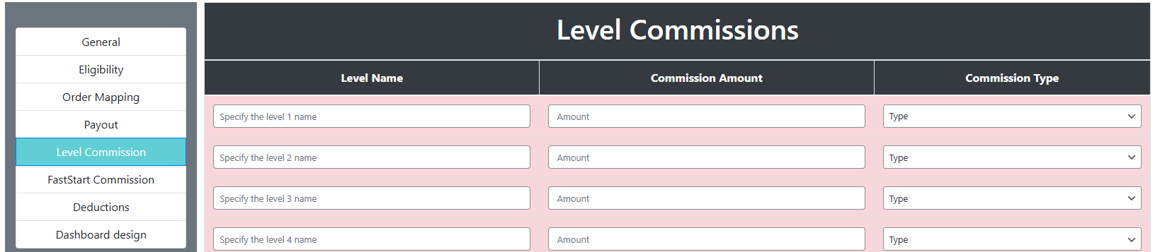 | Join Commission | When user places 1st order | Upline or Sponsor | Fixed / Percent |