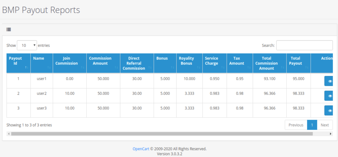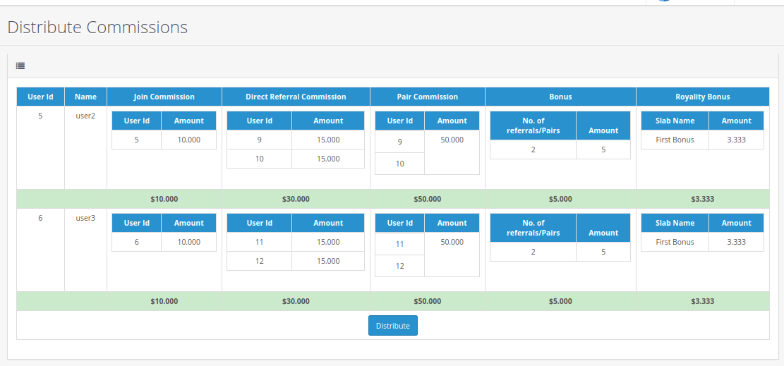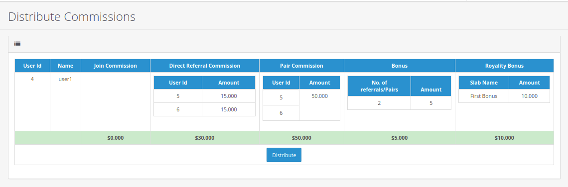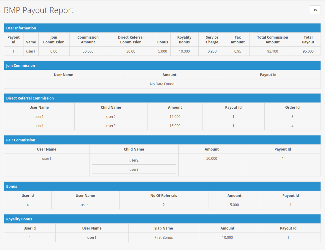 - Payout Report :Binary level payout reports section display all payouts list and here admin can check any payout details like join commission , referral commission , pair commission, bonus & royality bonus details .