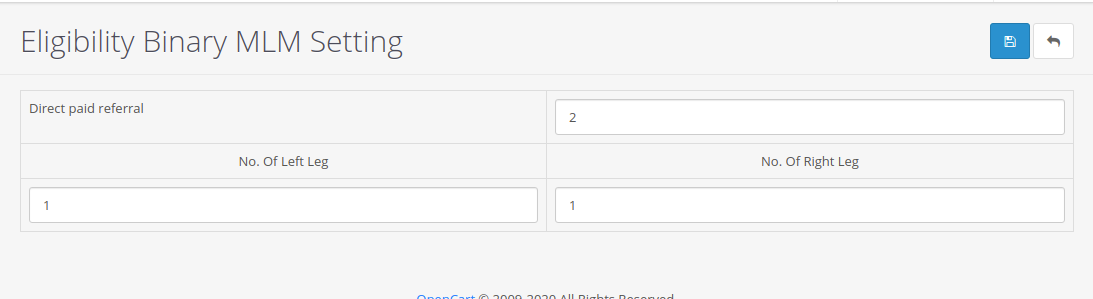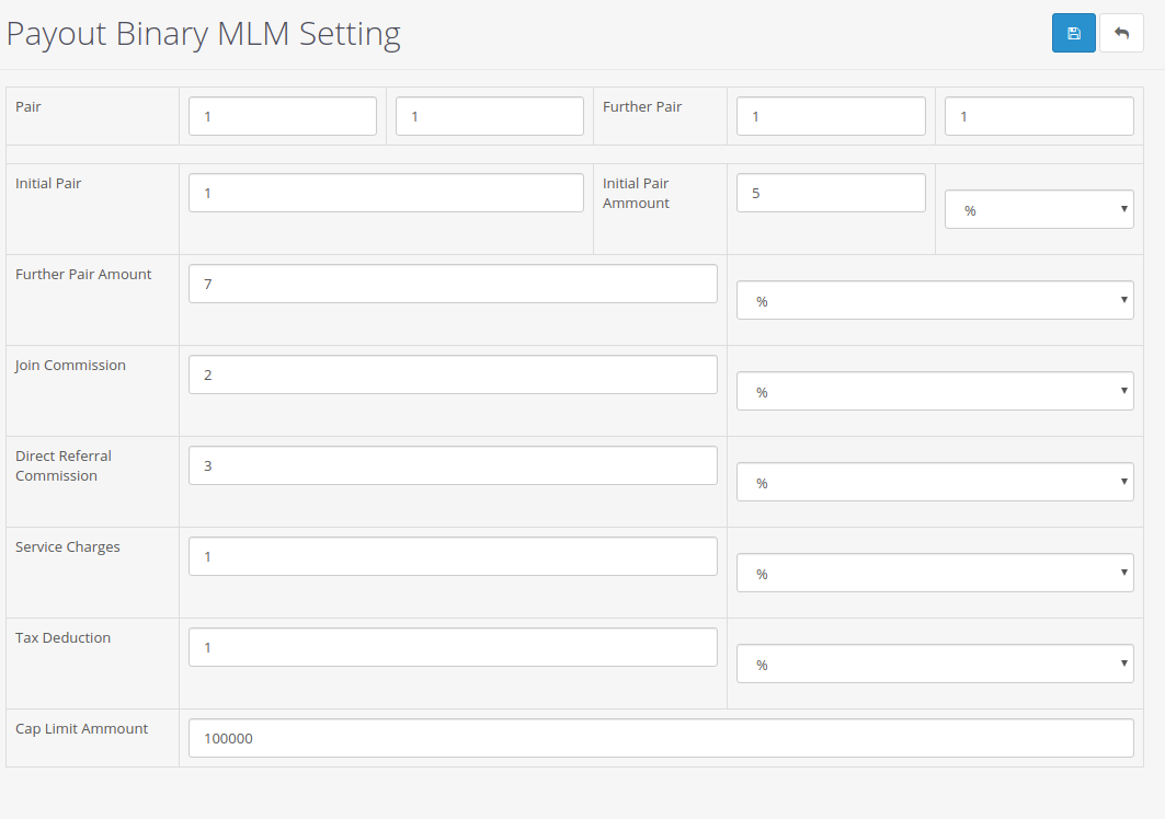 - Initial Pair Amount:This amount will be insert in user account when user have initial pair ratio down-liner like 1 in left and 1 in right.
