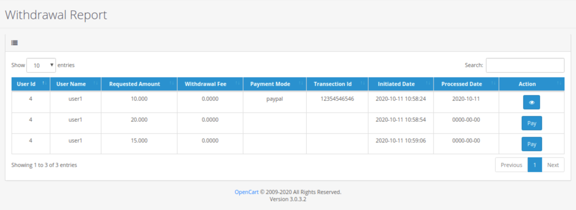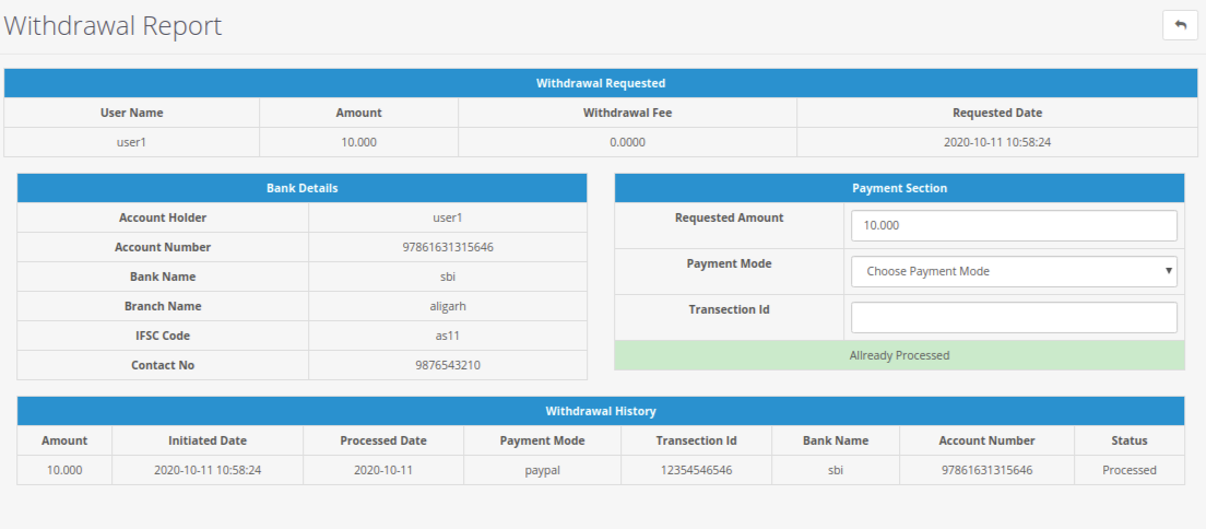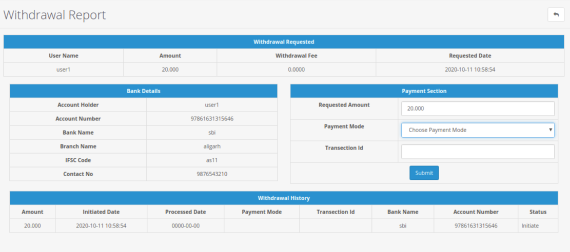 - Withdrawal Report : Withdrawal Report section display the all withdrawal requests and admin can pay the money by click on pay button .