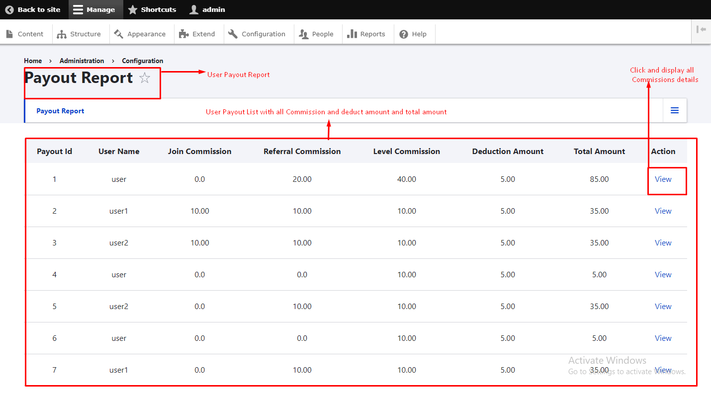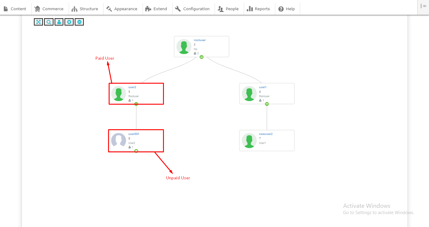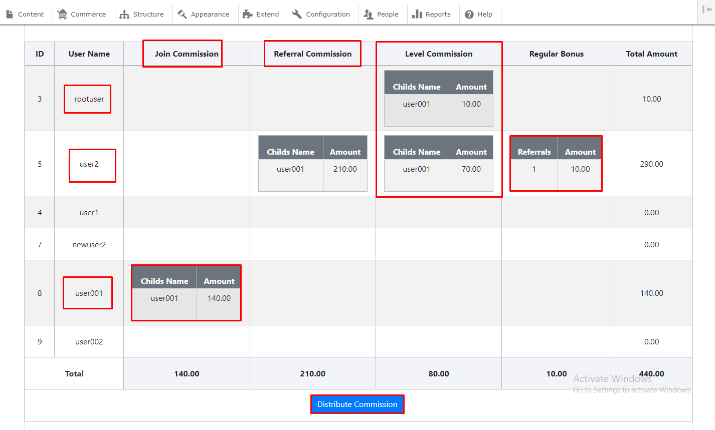 Go to Unilevel > User Report. Here you will see user reports listing with total comissions.
