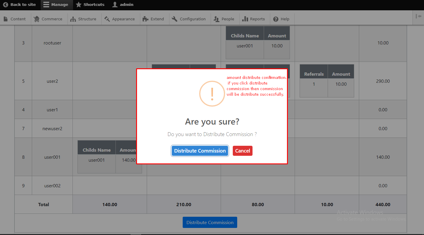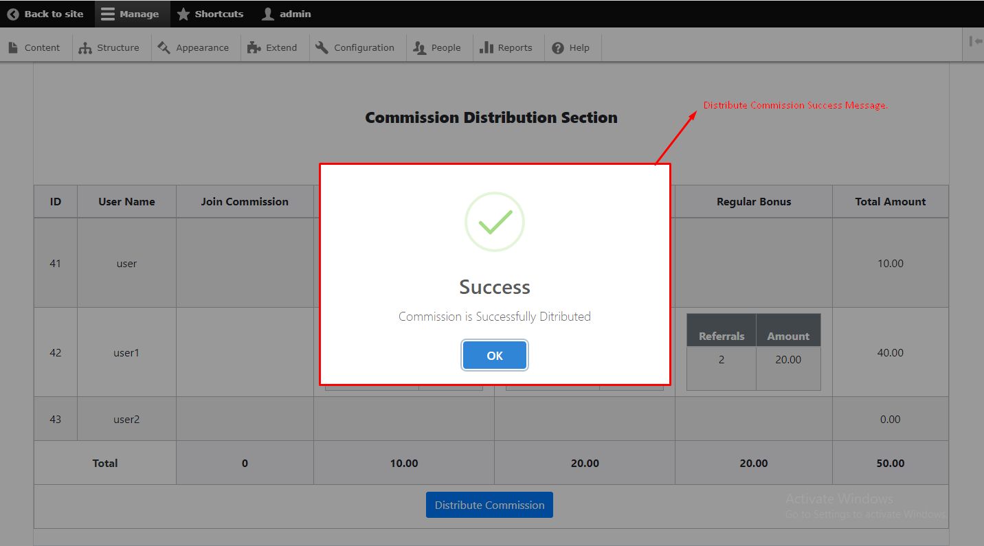 - Successfully distribute commission PopUp Message if commisssion distribute successfully.