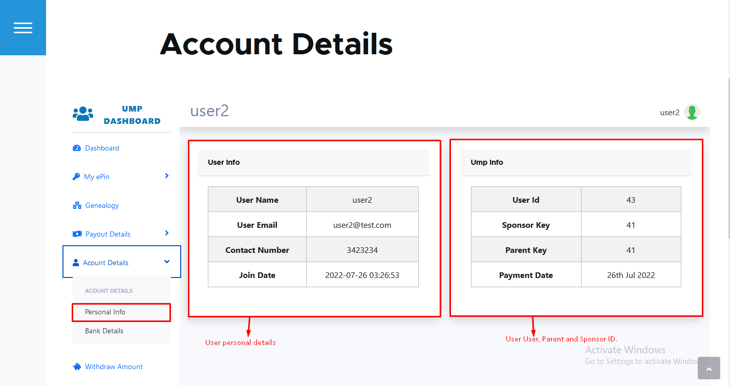 - Referral-Link -> Display User Referral Link , which link user can gives to any other to register and become Mlm Member.