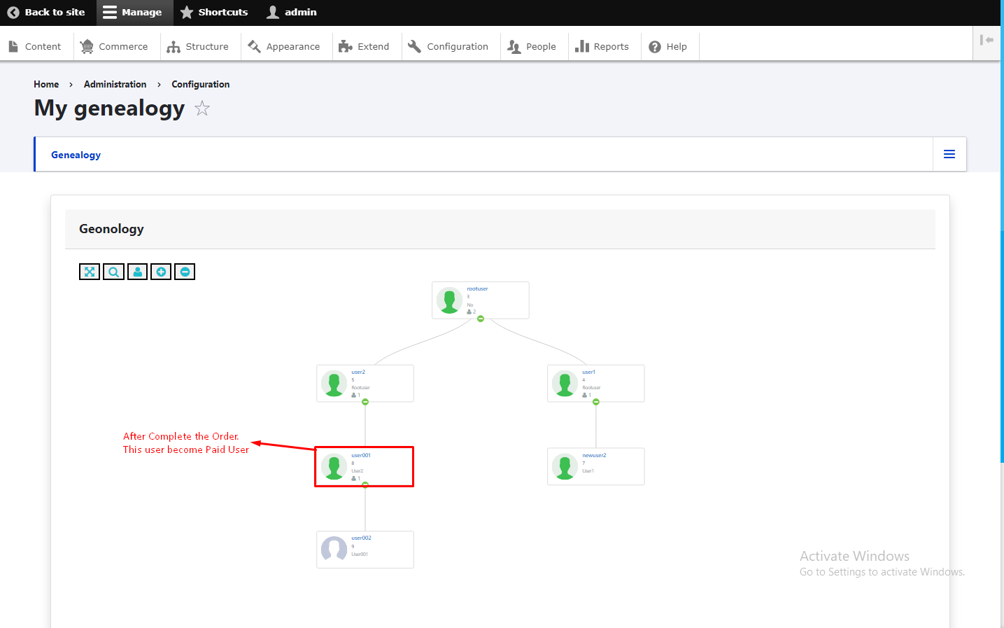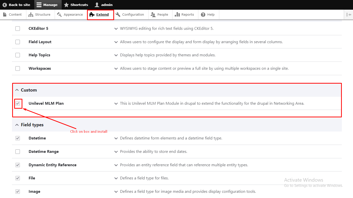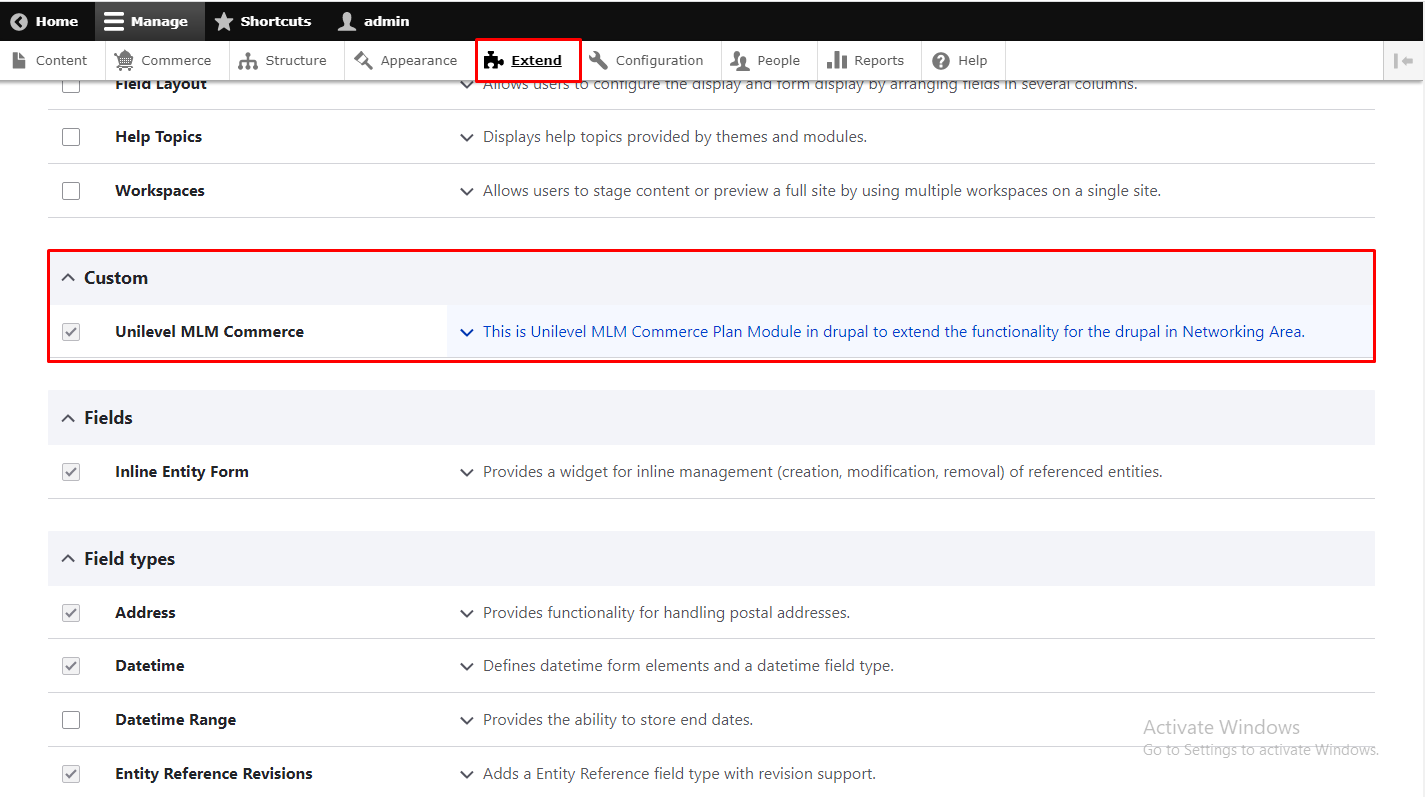 Installed Unilevel Mlm Commerce Modules:- You will go to Extent Tab -> Add new Module -> upload .tar.zh file of unilvelmlm commerce modules and continue. After Upload Unilevel Module successfully. You have to go again in Extend tab in menu then scroll our module will display in Custom with name of Unilevel Mlm Plan then Installed, But before Install Unilevel Module You will installed onse is (smtp), second is (phpmailer smtp) and third is (commerce) Modules then it will installed otherwise it will gives error of installed these three Modules.