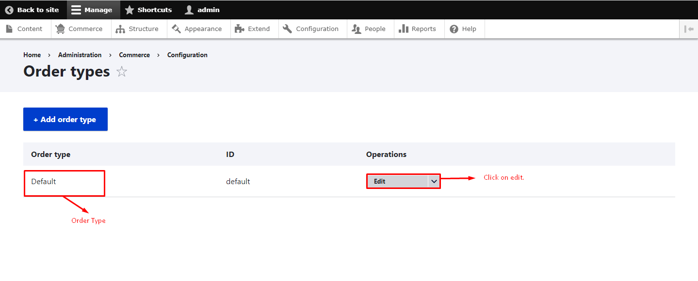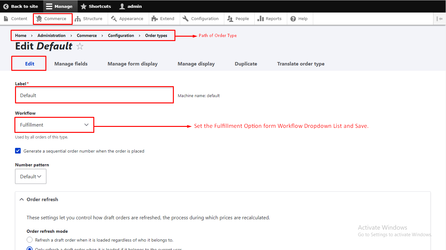 - Go to Commerce > Commerce Settings Update the order type Workflow.