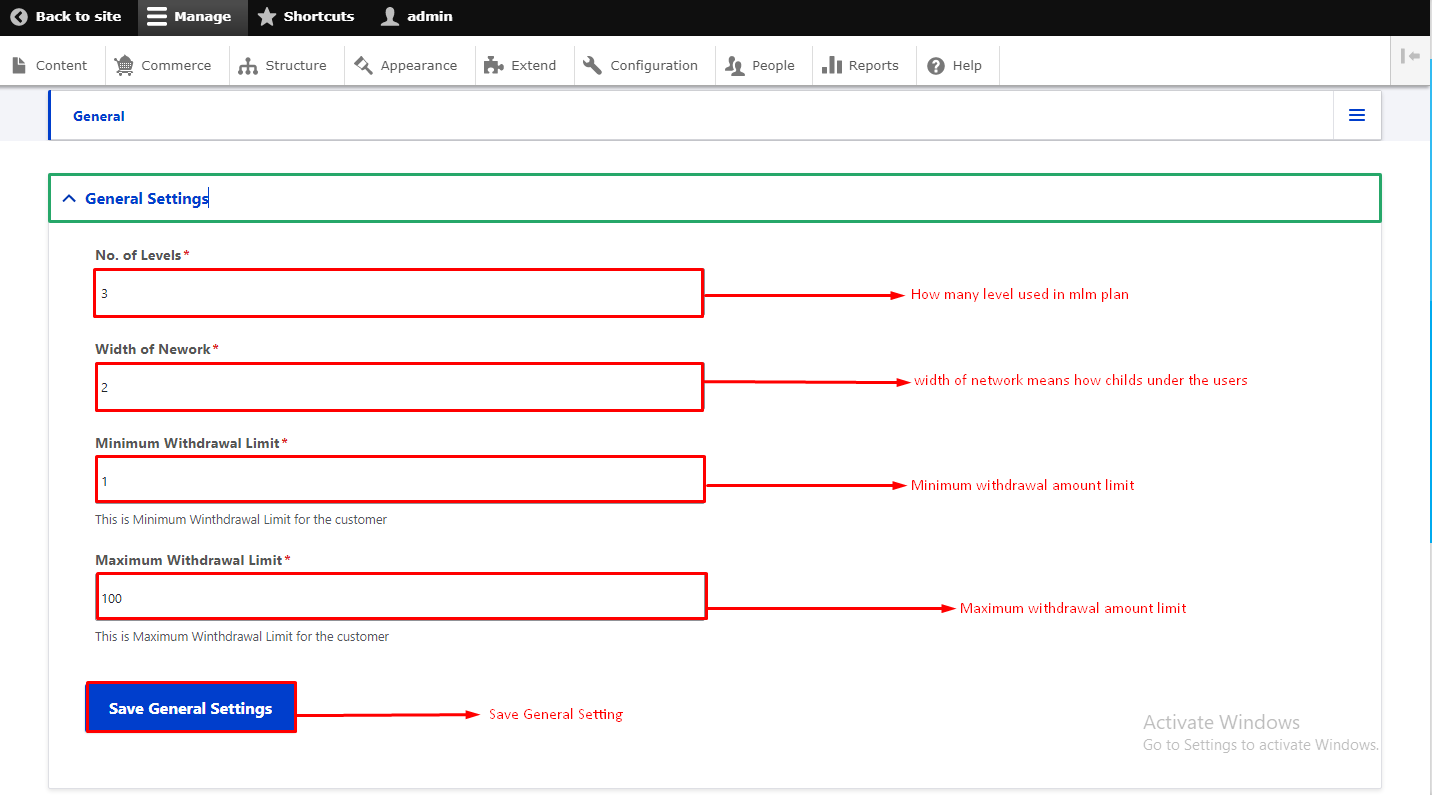 - Width of network --> Enter the width of network how much direct refferal add under the user.