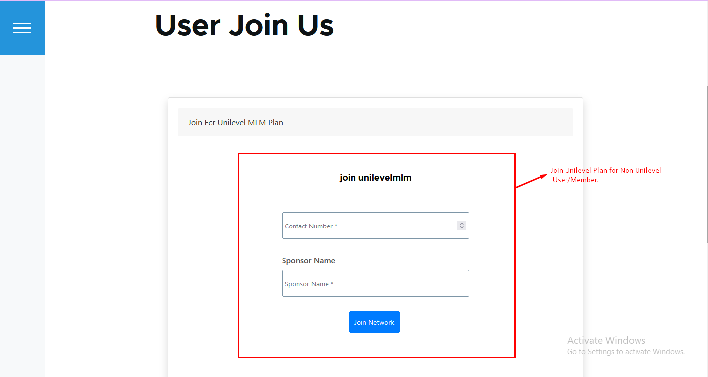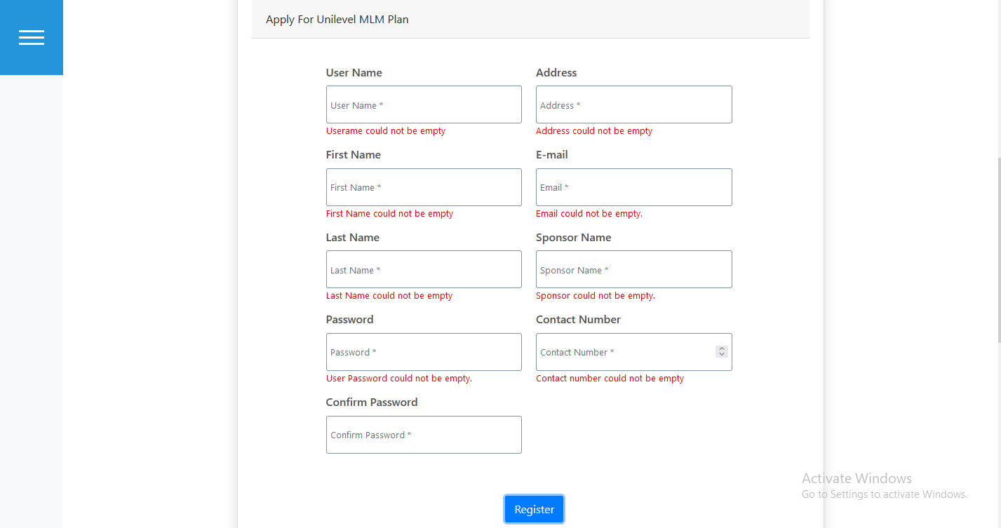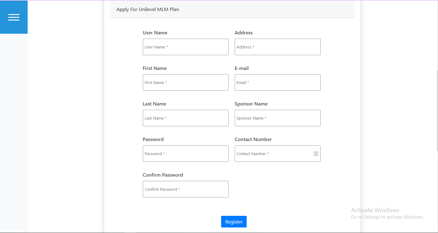 User can Register for beocome Unilevel Mlm Plan Member as hown in below figure.
