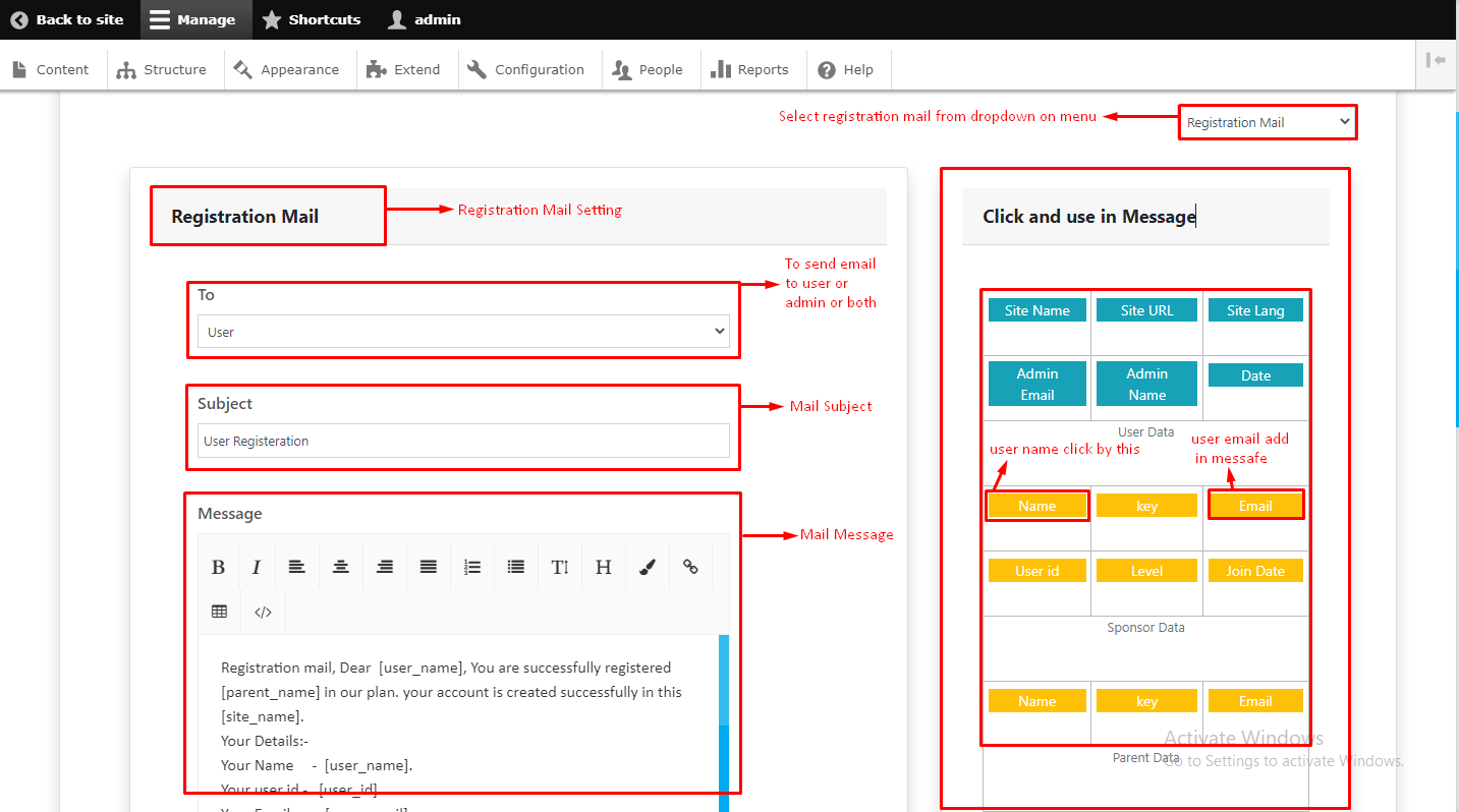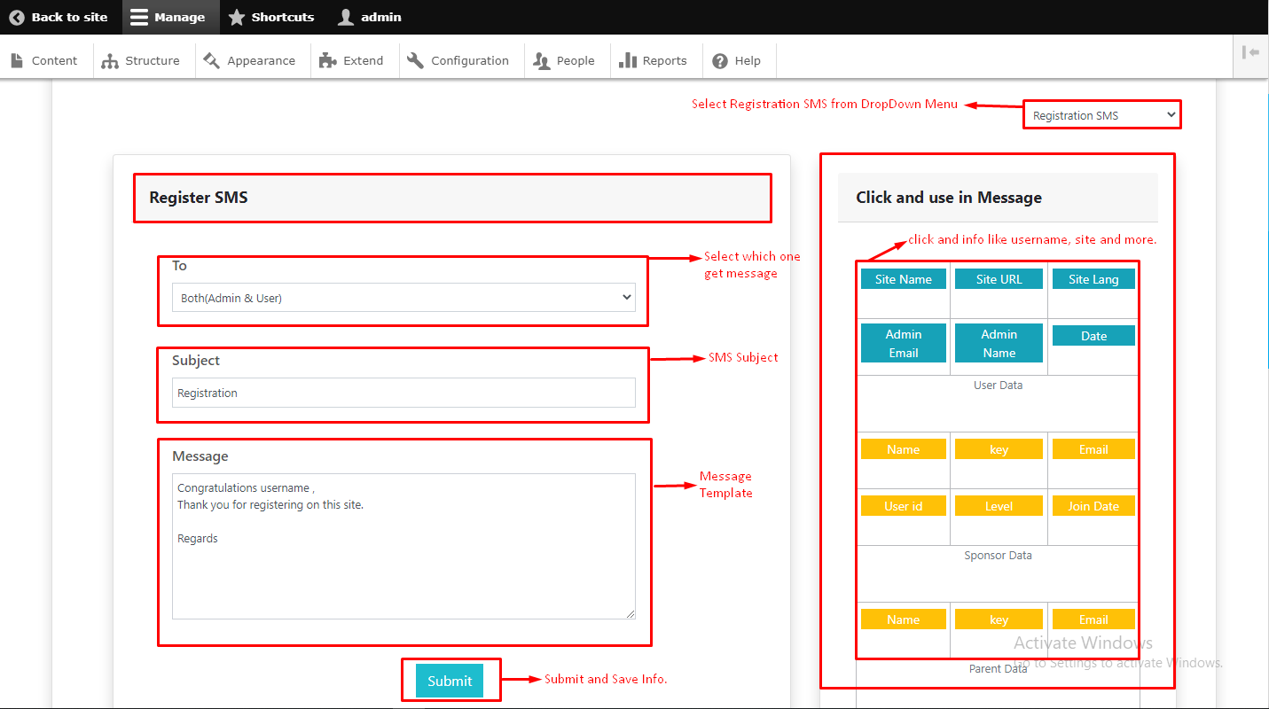 - Select sms from right menu like registration sms, withdrawal, payout etc.