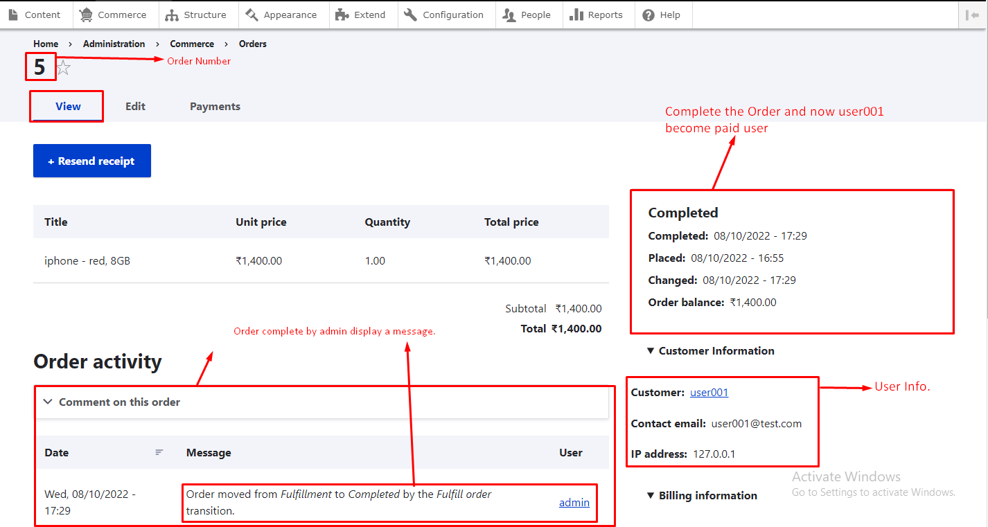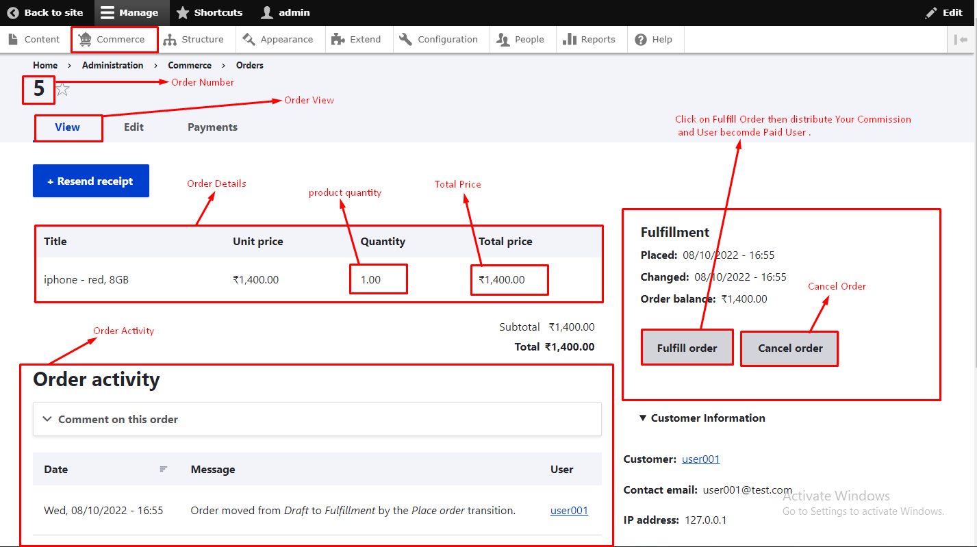 - Step 3 :- Go to View Tab display the order information and also diplay the Fulfillment in which display the Fulfill Order Button then You will click on this Button for Complete the Order as shown in below figure.
