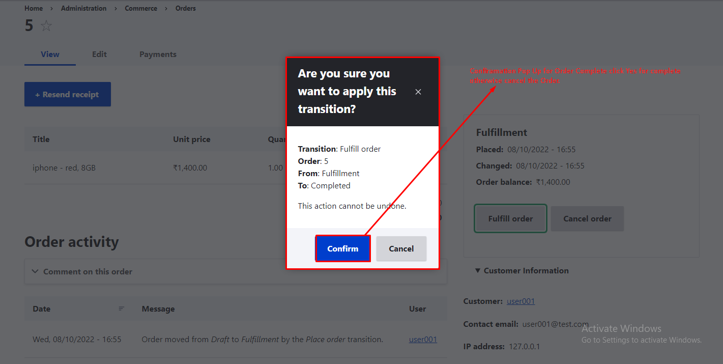 - Step 4 :- After click on Fulfill order button confirmation will be display then click on confirm button the complete the order as shown in below figure.