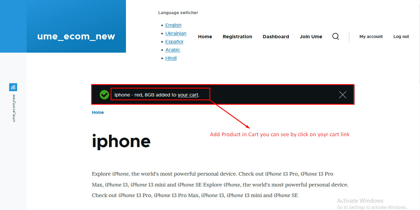 - Step 2 :- add the product in Cart the message will display that product is added in the cart then click on view cart.
