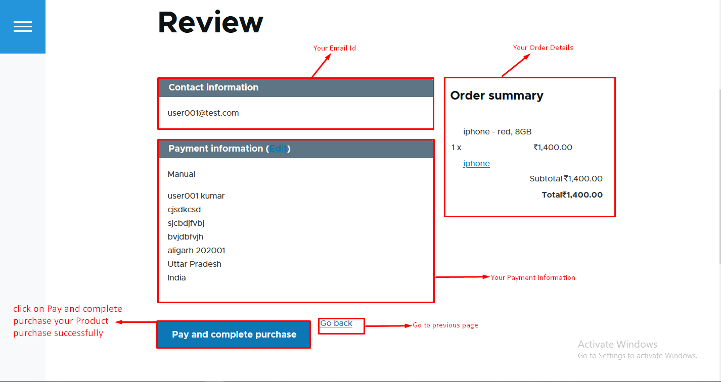 - Step 3 :- Display the contact information, payment information and order Summary then click on pay and complete purcase.