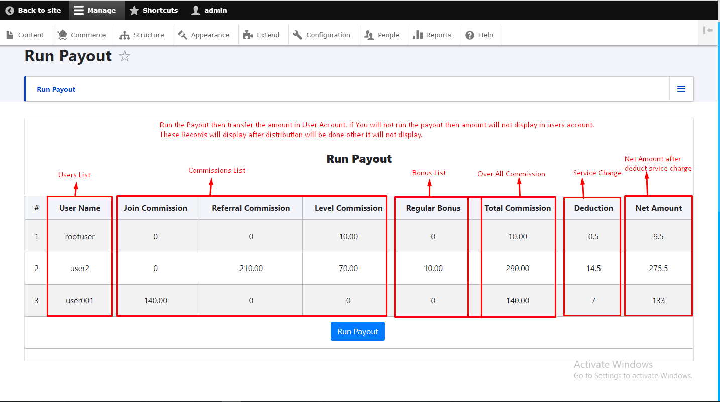 - Run Payout: All commission, bonus and deduction is display here after distibution.