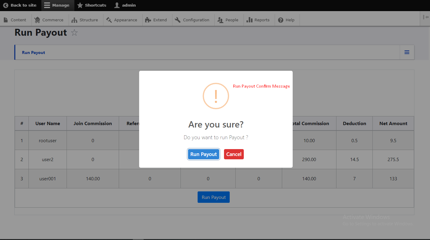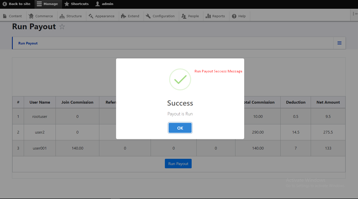 - Successfully run payout commission PopUp Message if commisssion run payout successfully.