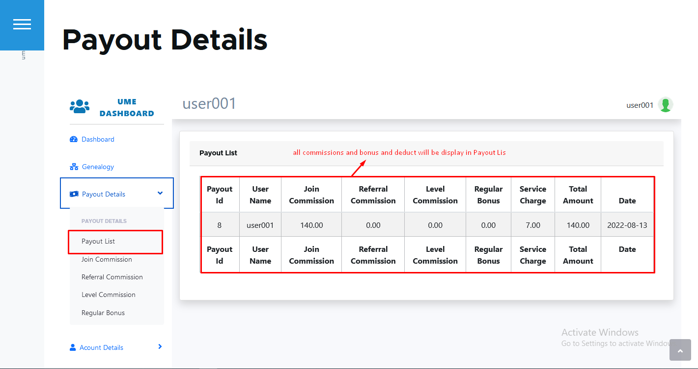 Go to Unilevel > Run Payout in Menu. Here is all type of commission and bonus and also display service charge as a deduction amount that user will get.