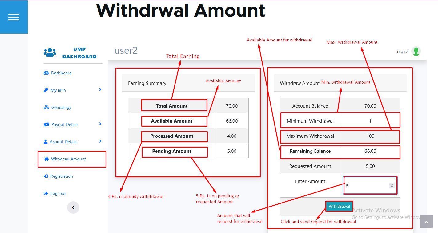 - Withdrawal the Amount click on withdrawal button in Withdrawal Amount menu.