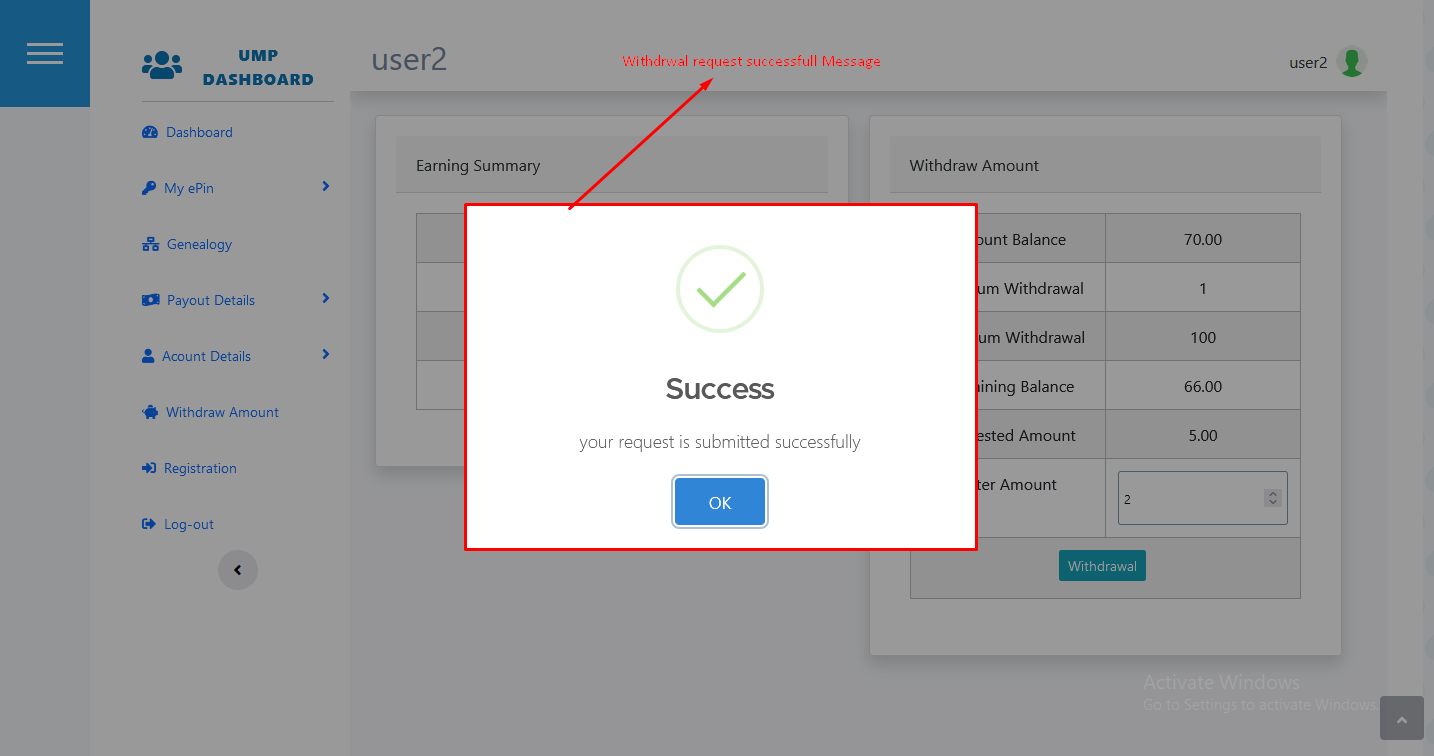 - withdrawal request Success message will display. It means that your withdrawal amount request send successfully to admin. as show in below figures.