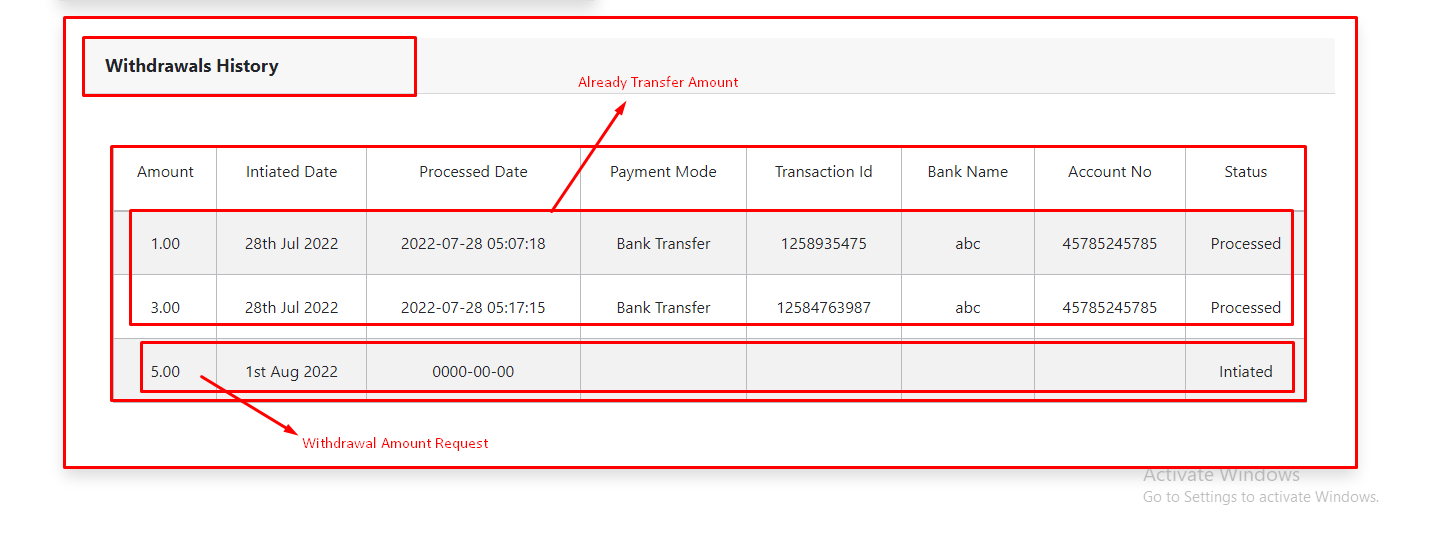 - To transfer details of witdrawal click on action transfer Link, here you will see the user's witdrawal requset and withdrawal history and bank details of users and transfer the amount