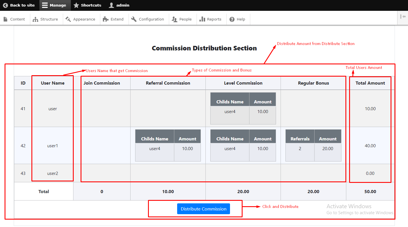 - Distibute Commission : Here you have the report of all users commission > here you check how much level, referrel, join commisson and regular bonus user has been gotted.