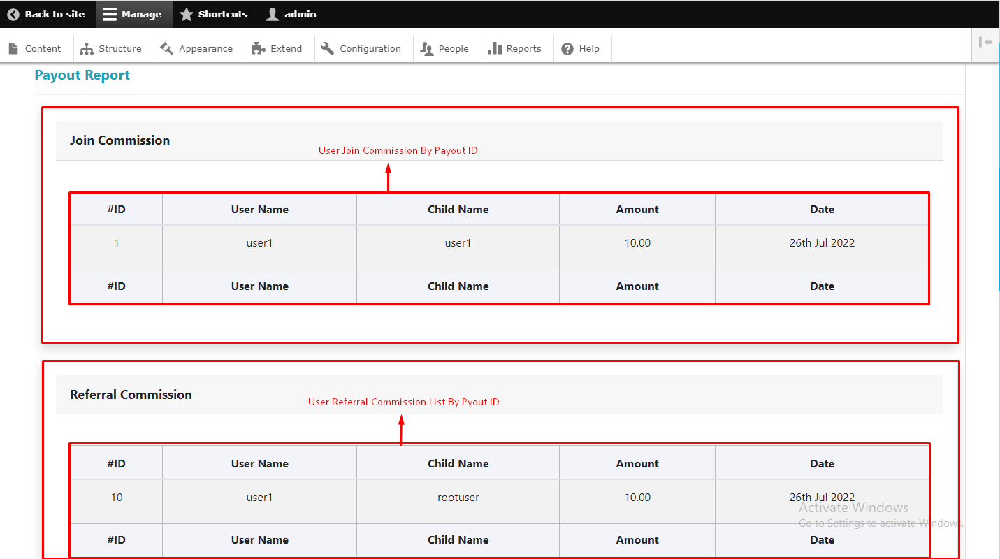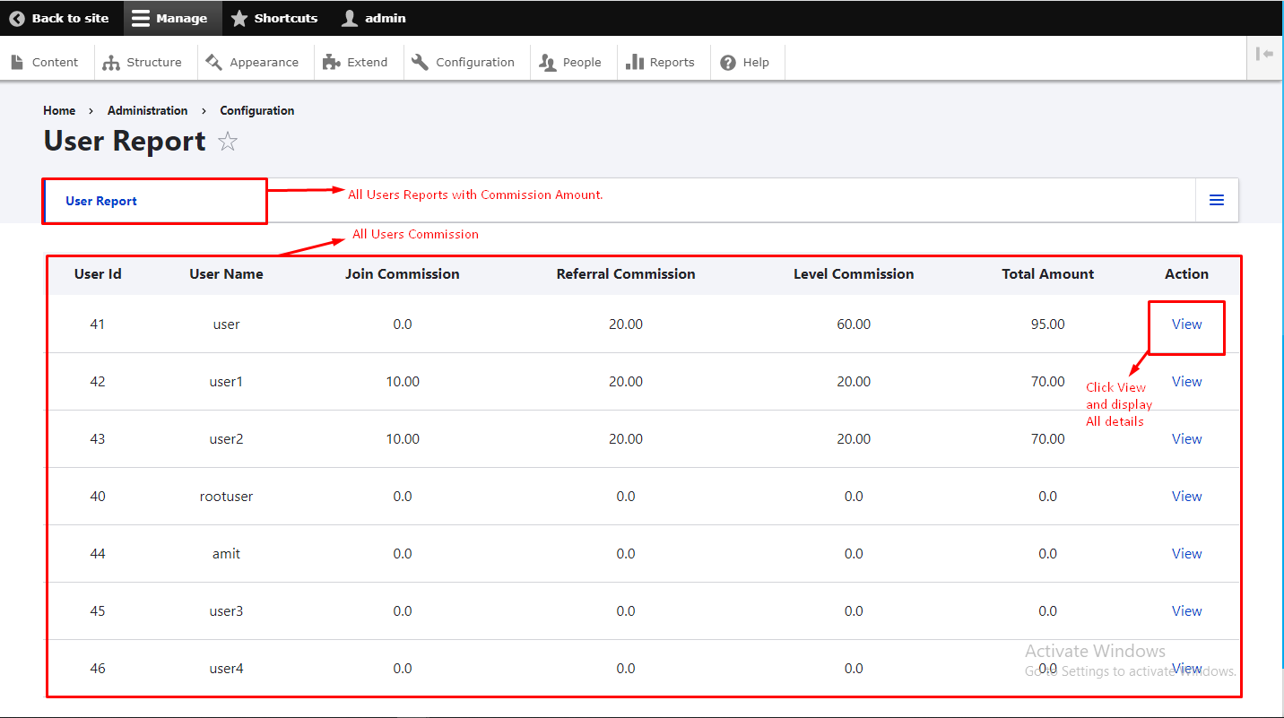 Go to Unilevel > User Report. Here you will see user reports listing with total comissions.