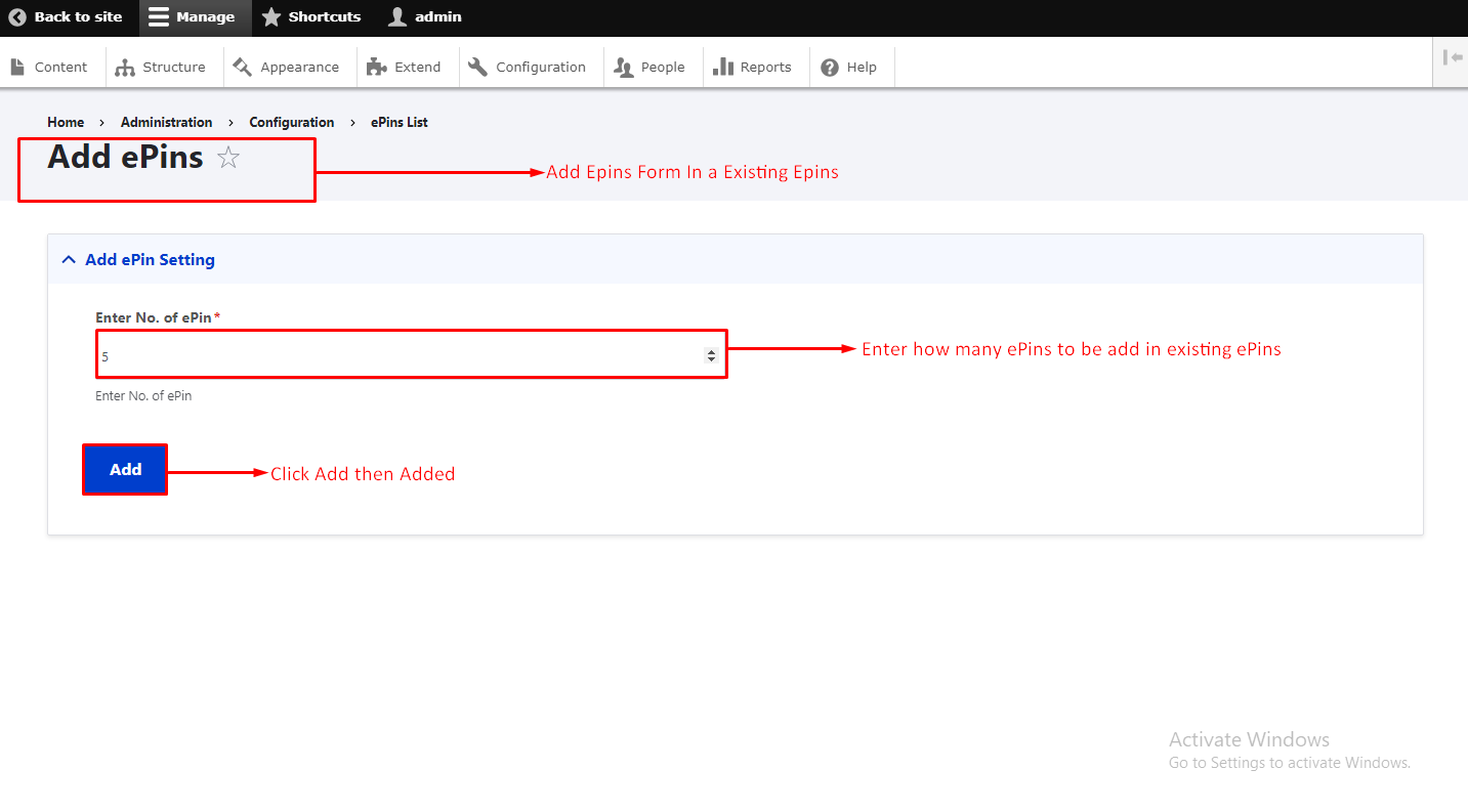- Click on Add button to Add more epins in this ePin Name but add 100 only single times.