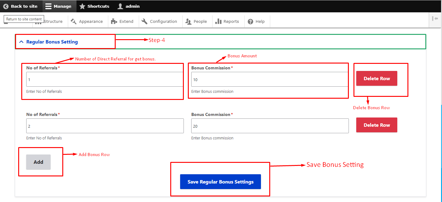 - Example --> Suppose you enter 1 direct referral and 10 Bonus Commission if user add 1 dowenlines then use 10 Rs. bonus Ampount amount, in the next textbox you give 2 direct referral if user add 2 dowenline then he is eligible for the amount user get 20 Rs. , you can add or delete bonus by click on add and delete Row.