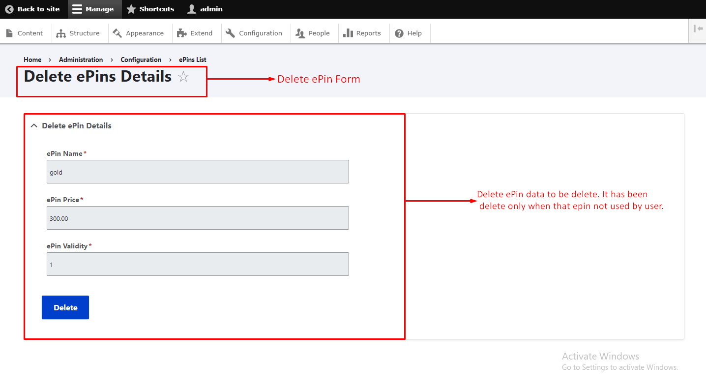 - Click on Delete button to Delete ePin but it should not be used otherwise it will not delete.