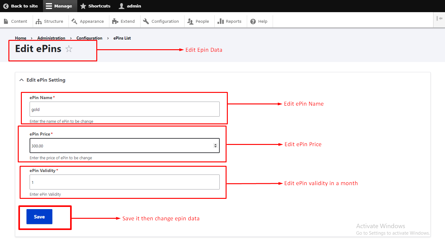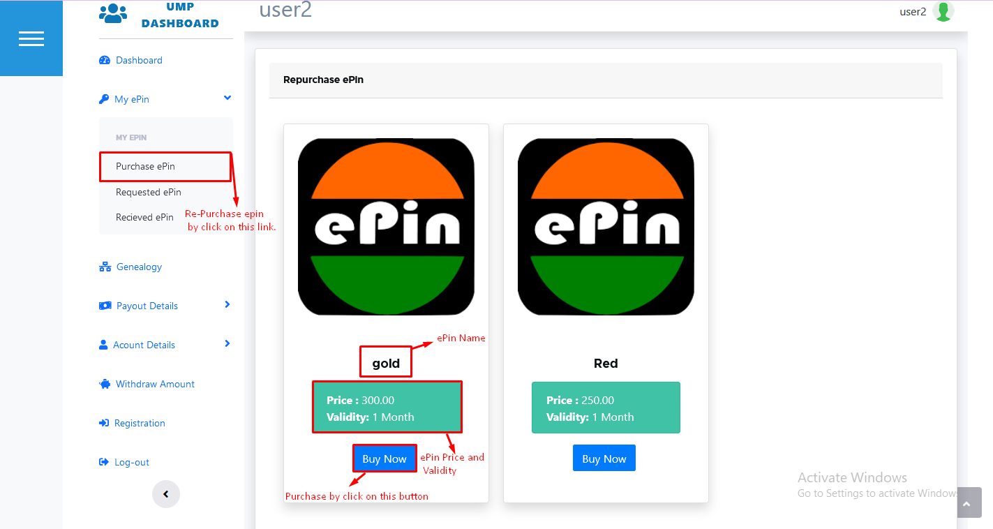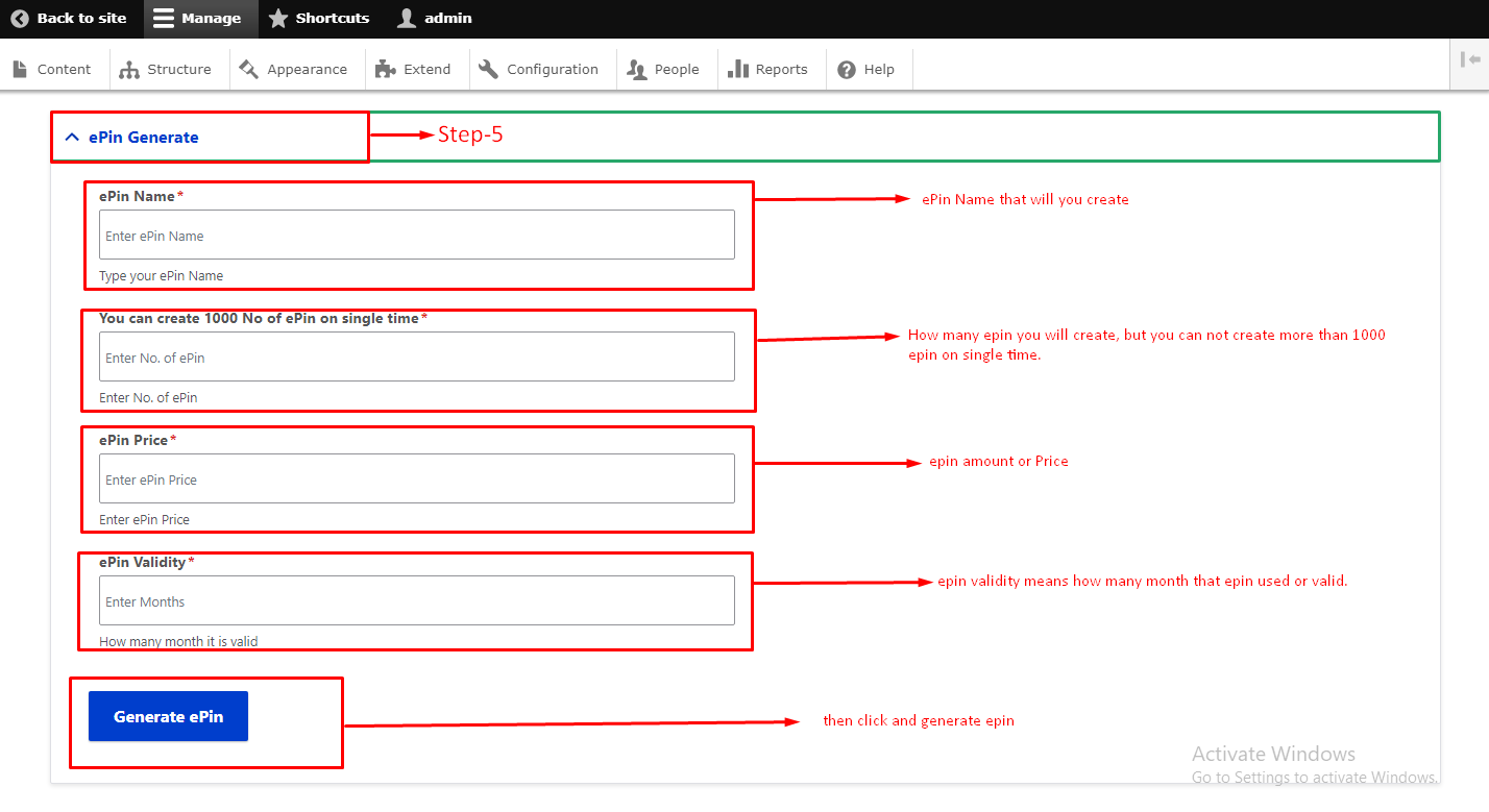 - ePin Validity--> Enter ePin validity in a month. It means that how many month this ePin will expired then purchse again new ePin but before you will check activate repurche ePin in general Setting otherwise ePin will expired.