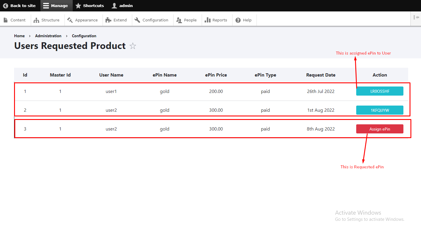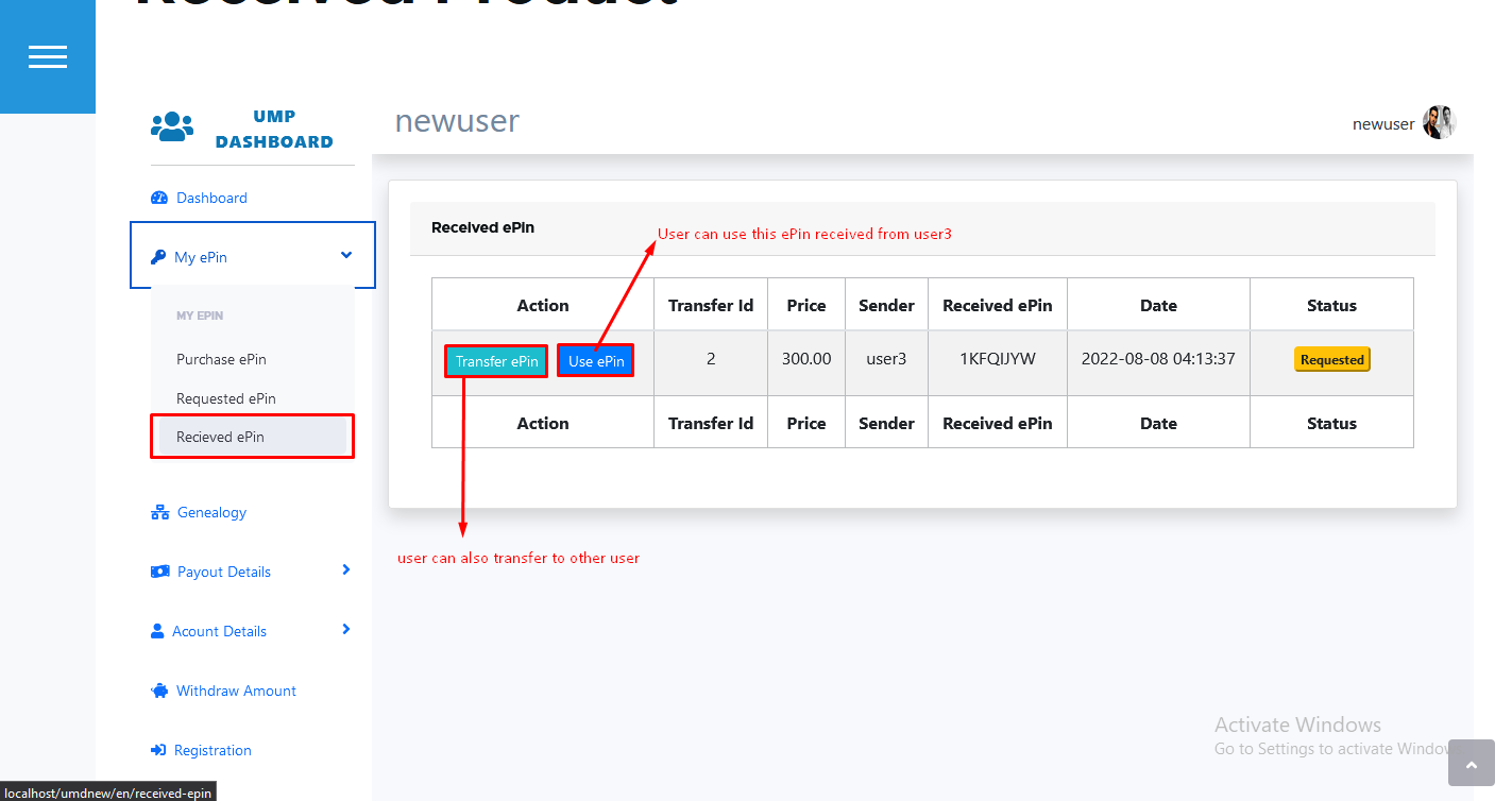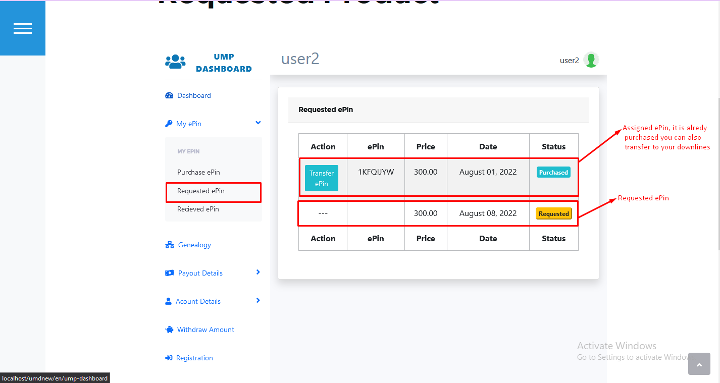 - Requested Epin It means you can display requesd ePins that will be reques from the users and you can assigned also to to the users.
