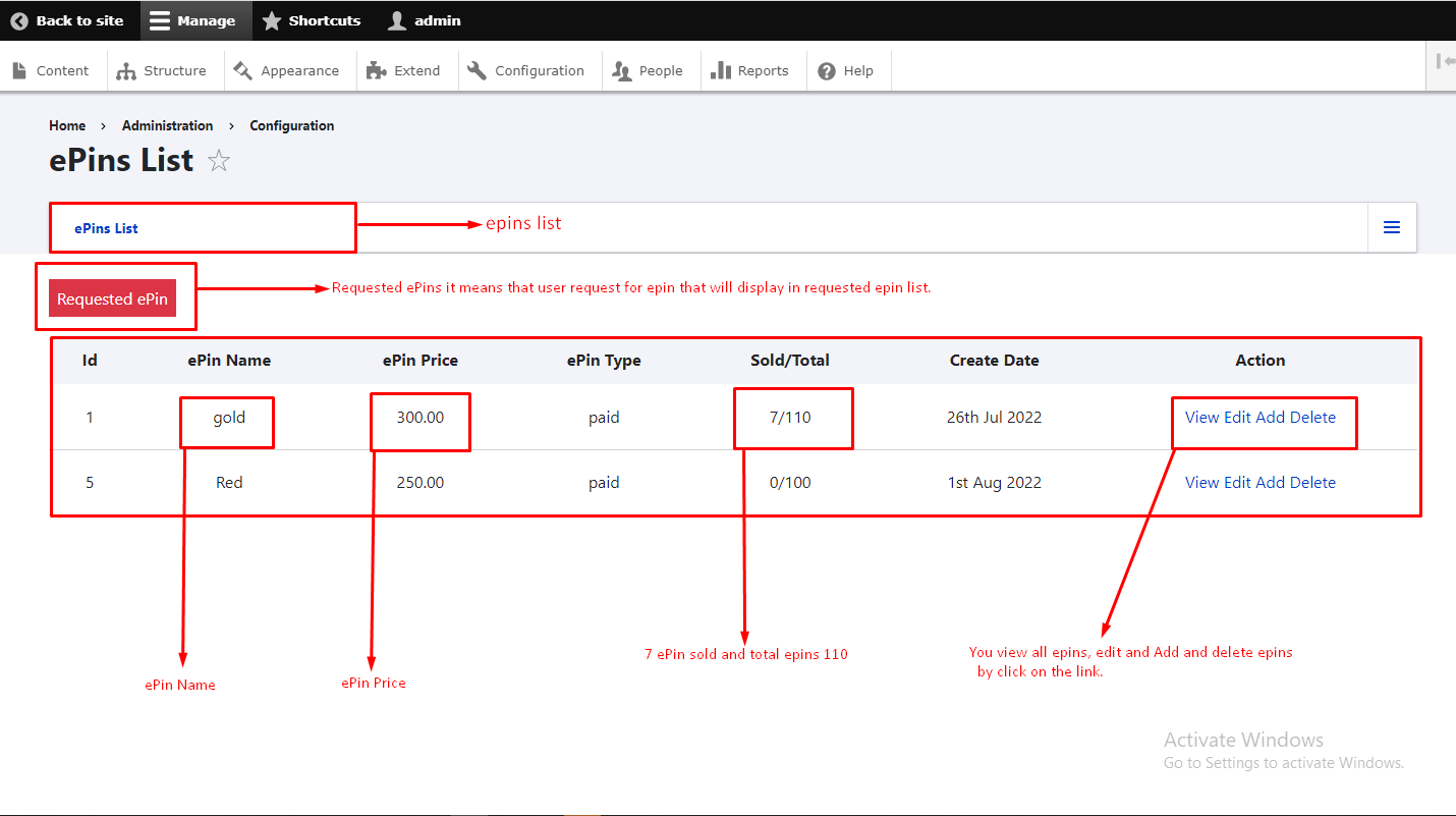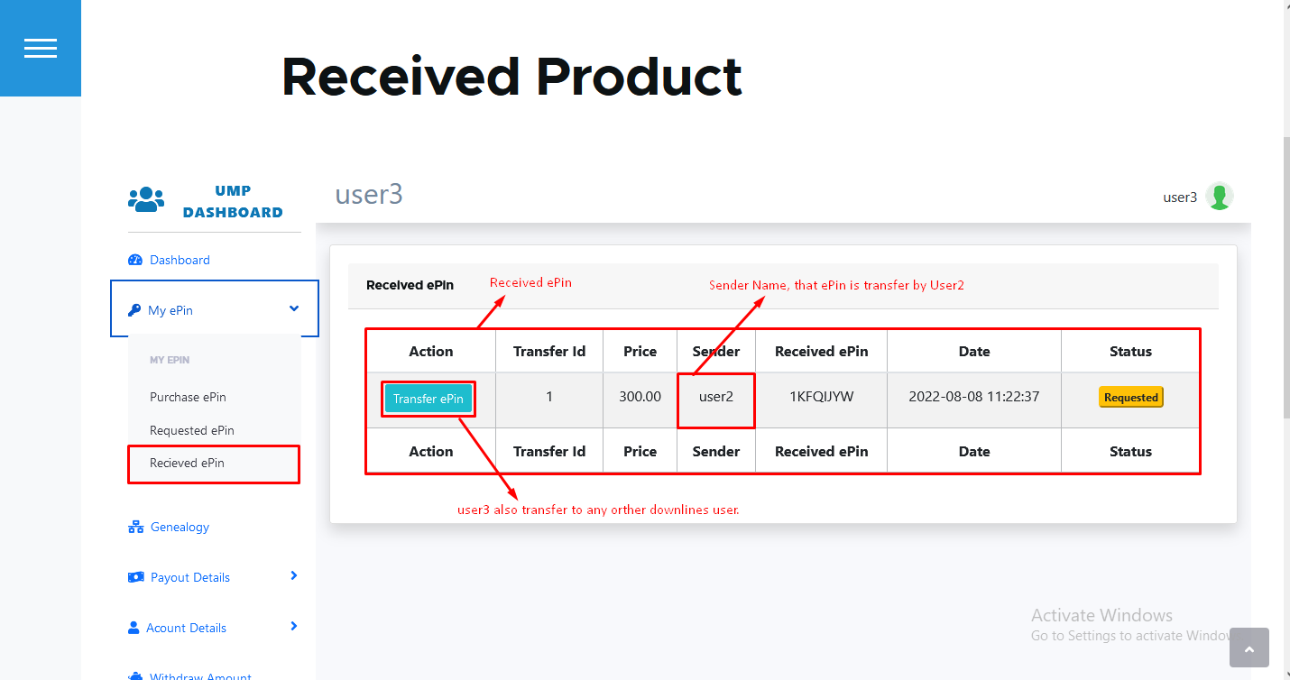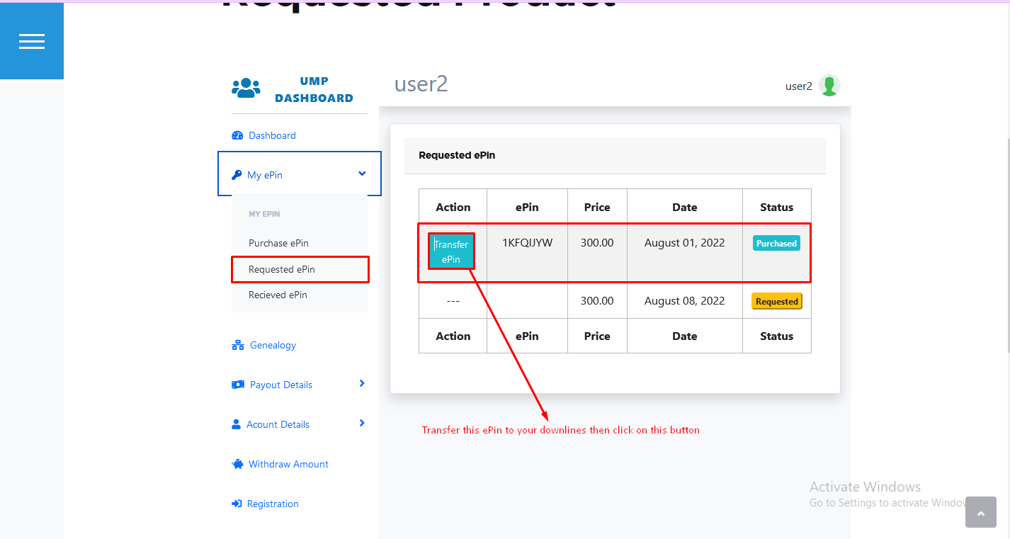 - Requested Epin It means you can display requesd ePins that will be reques from the users and you can assigned also to to the users.