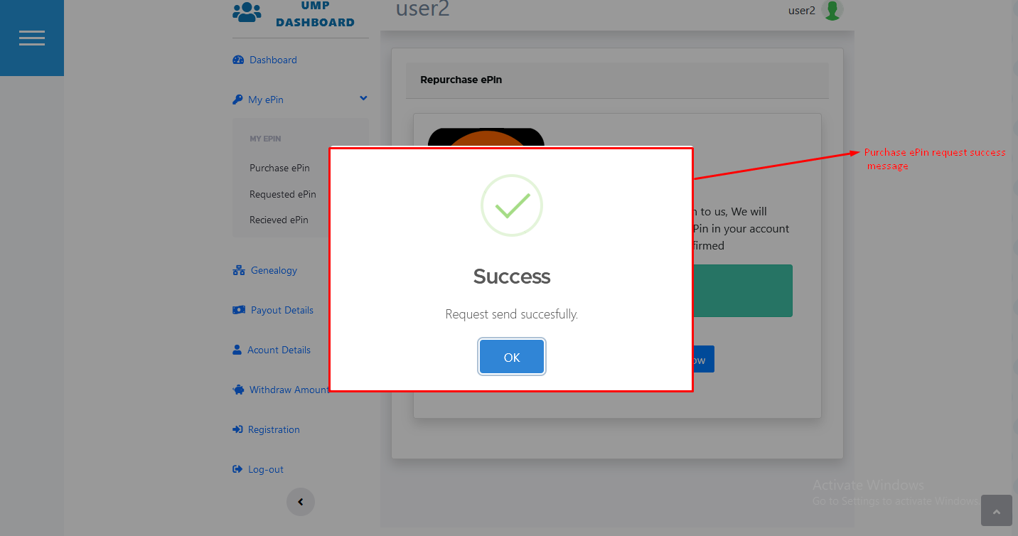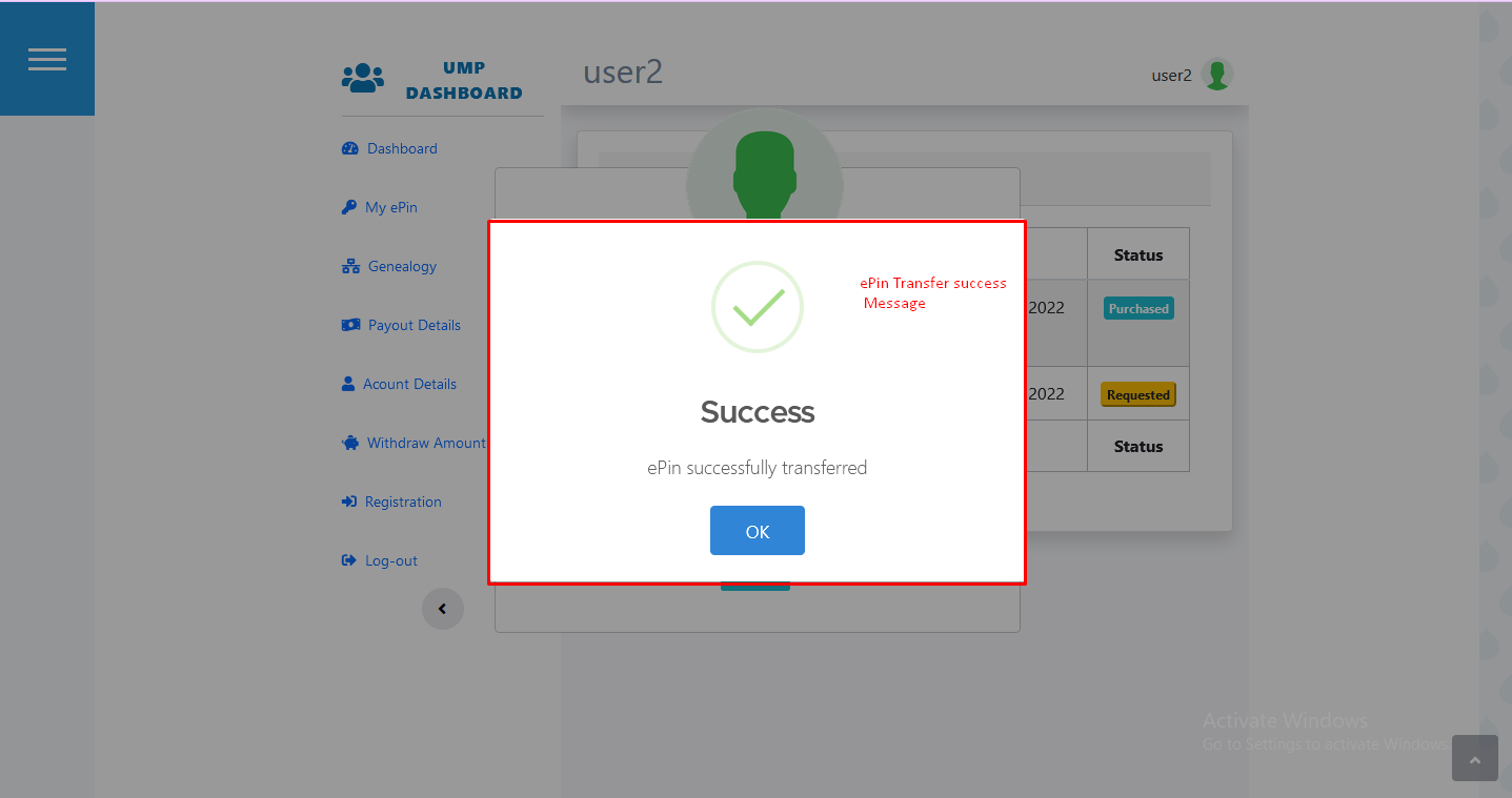 - Step 2 :- Display the Transfer epin Success message. It means that your epin transfer successfully.