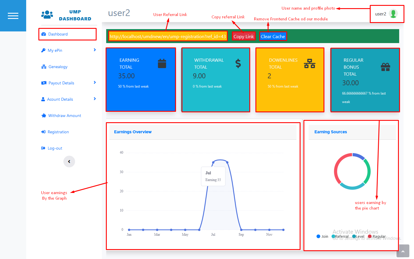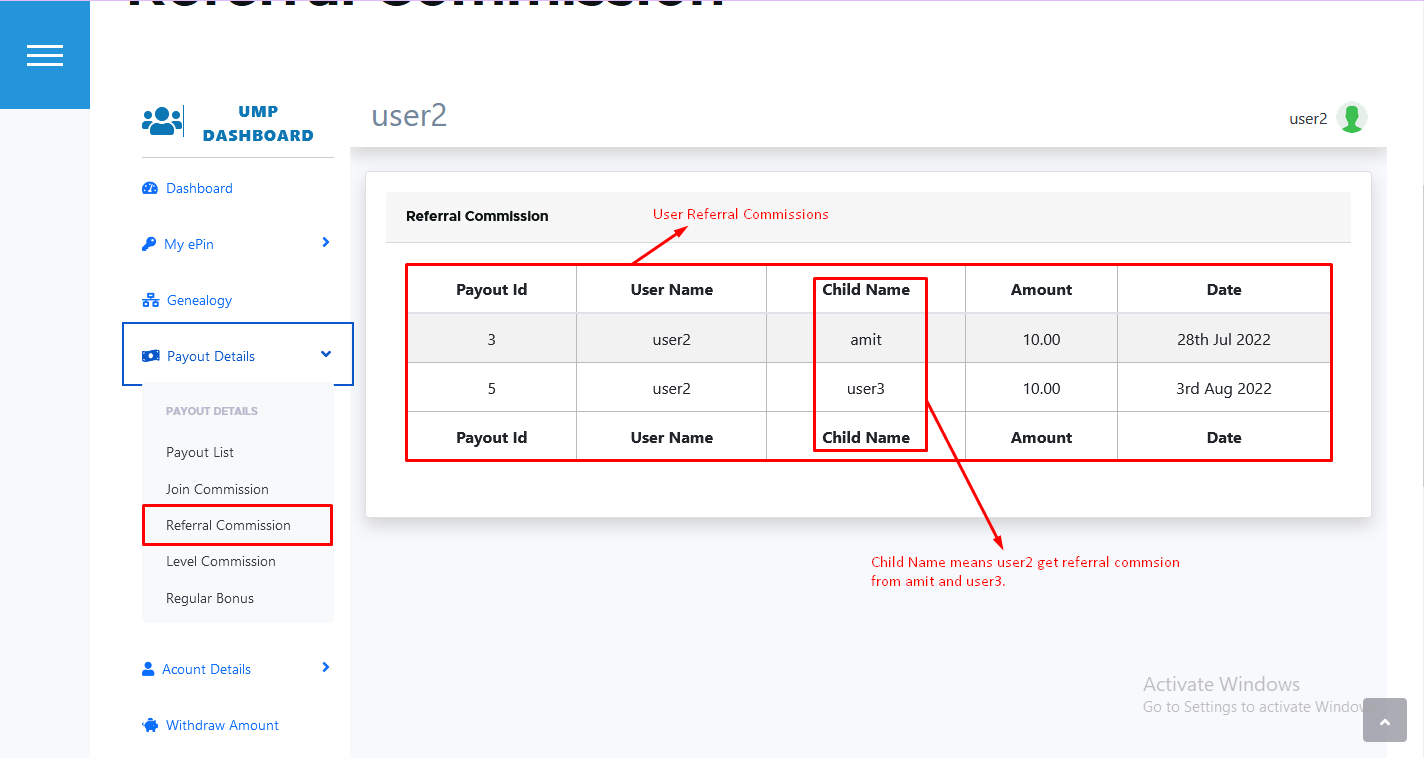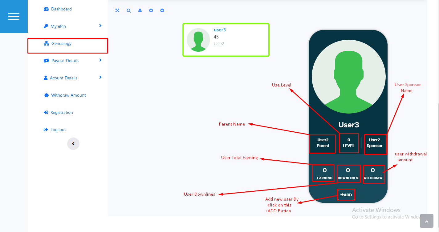 - Referral-Link -> Display User Referral Link , which link user can gives to any other to register and become Mlm Member.