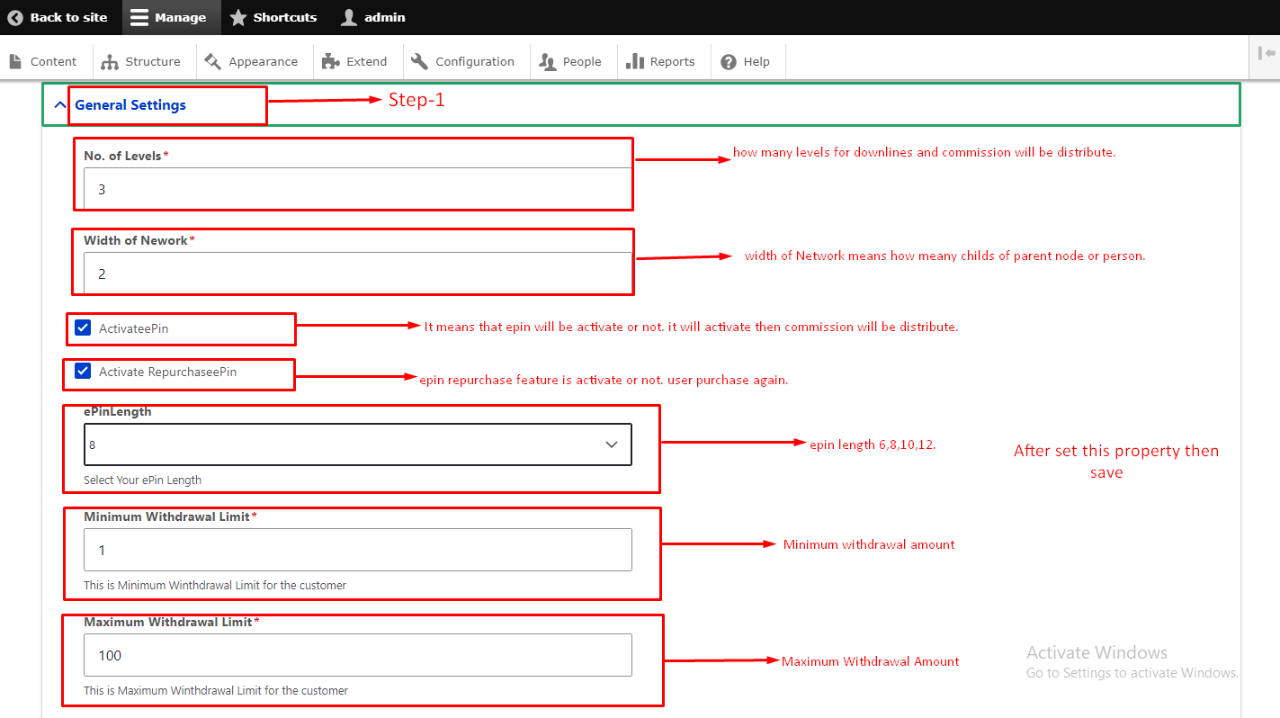 - Width of network --> Enter the width of network how much direct refferal add under the user.