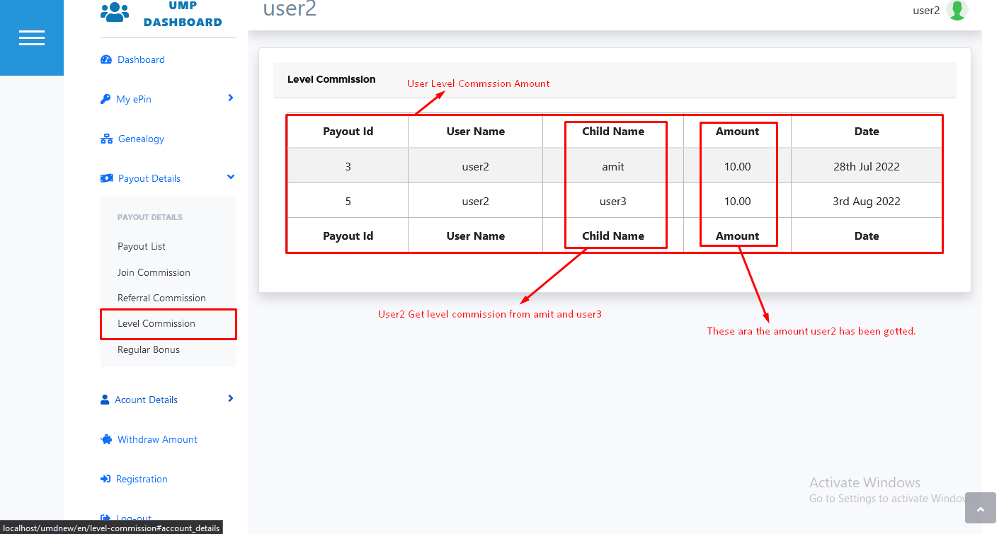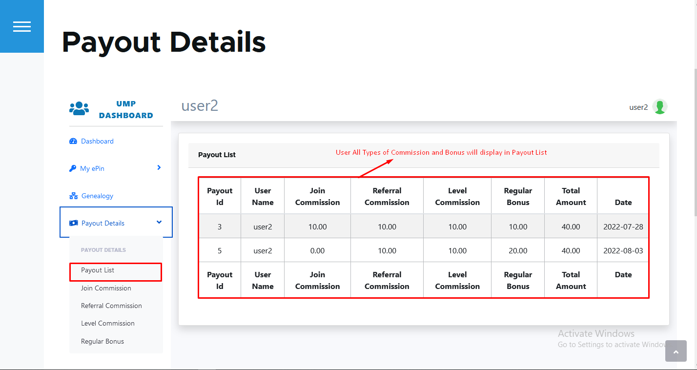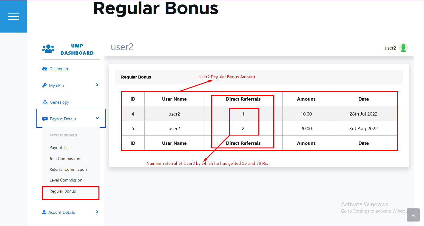- There are three type of join, level, referrel commission is for user and as well as regular bonus will display only for user.