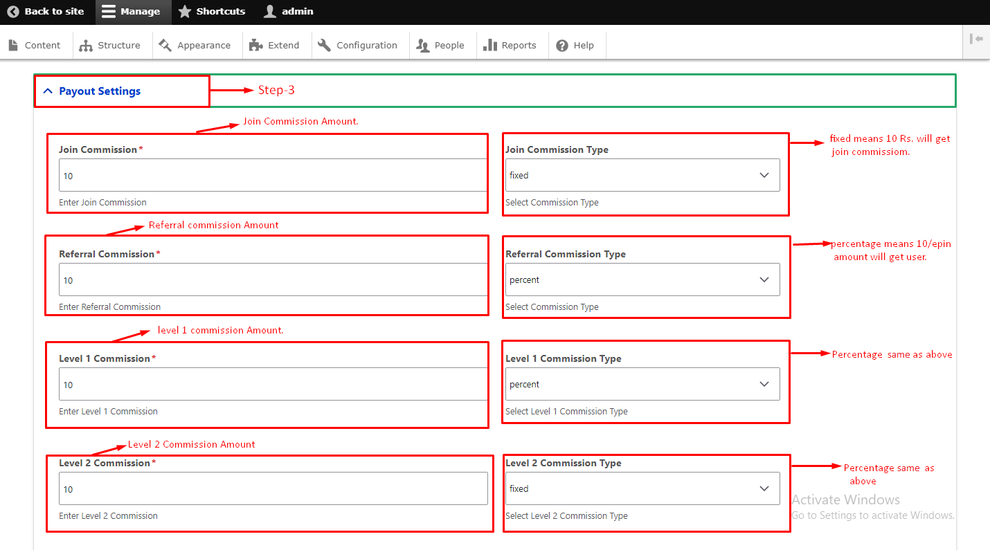 - Join commission --> Enter join commission amount in percent or fix amount, this amount user will get at the the time of joining only once.