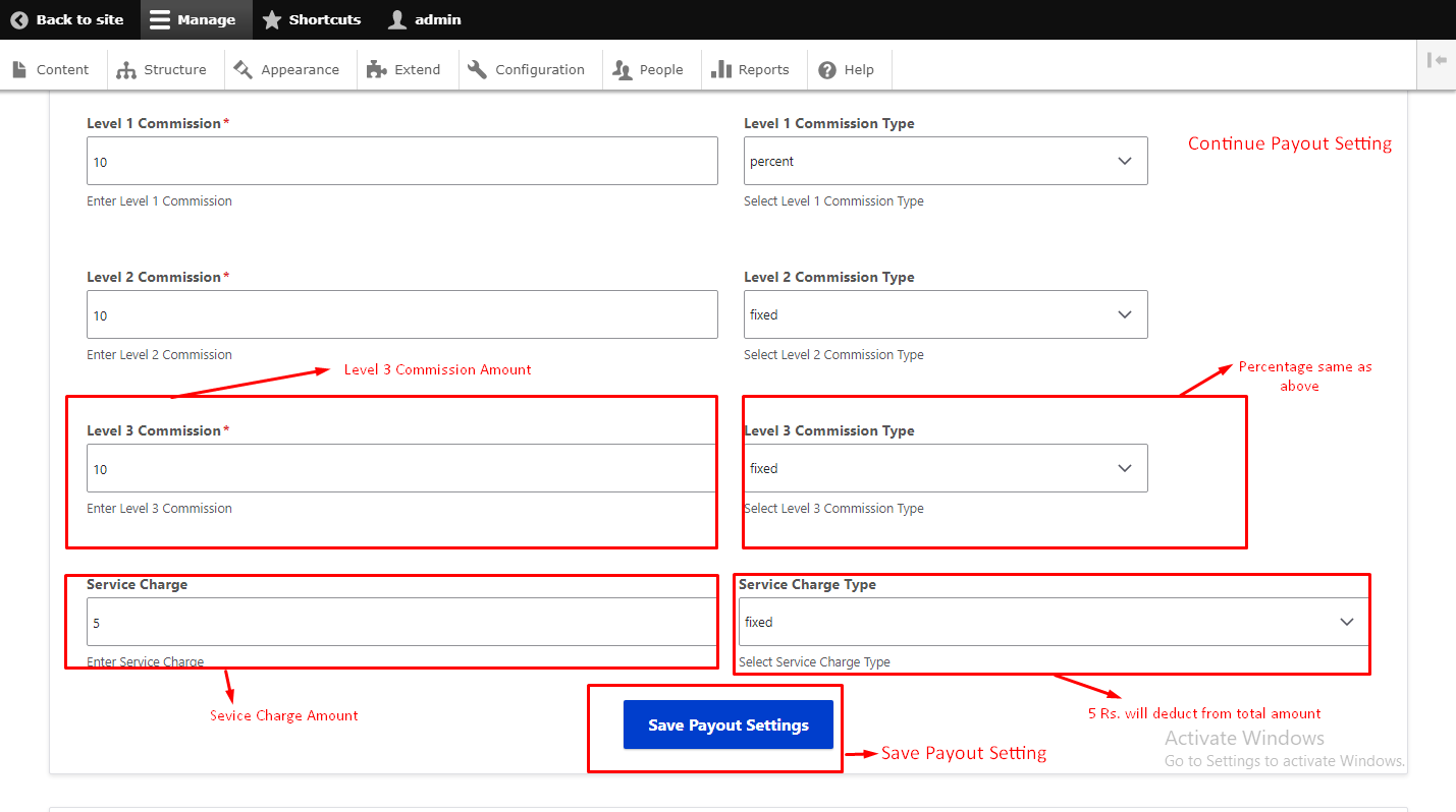 - Service Charge --> You can add Services Charge in percen or fixed, It will deduct from total commission amount when payout will be run.