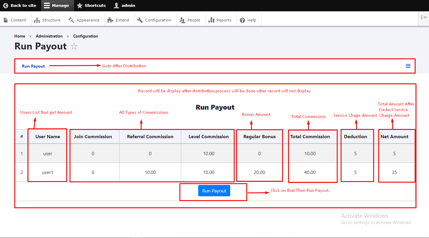 - Run Payout: All commission, bonus and deduction is display here after distibution.