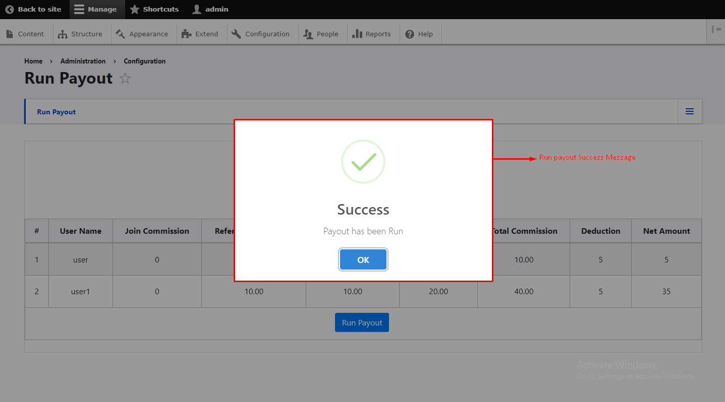 - Successfully run payout commission PopUp Message if commisssion run payout successfully.