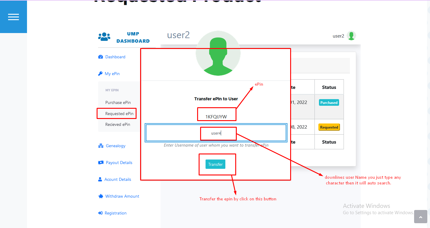 - Then Open the Pop Up for Transfer ePin Then Enter Your Downlines Name it is also auto Search and Click on Transfer