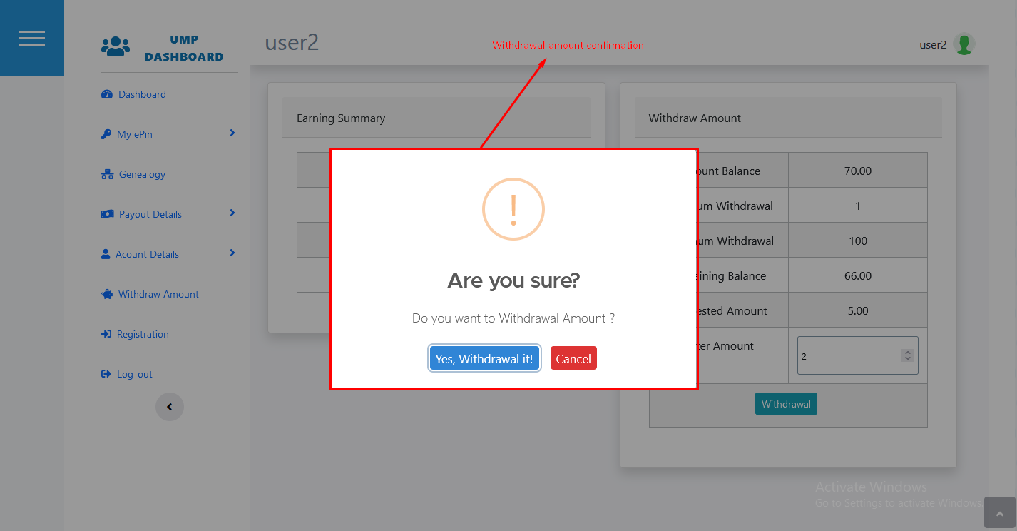 - Withdrawal the Amount click on withdrawal button in Withdrawal Amount menu.