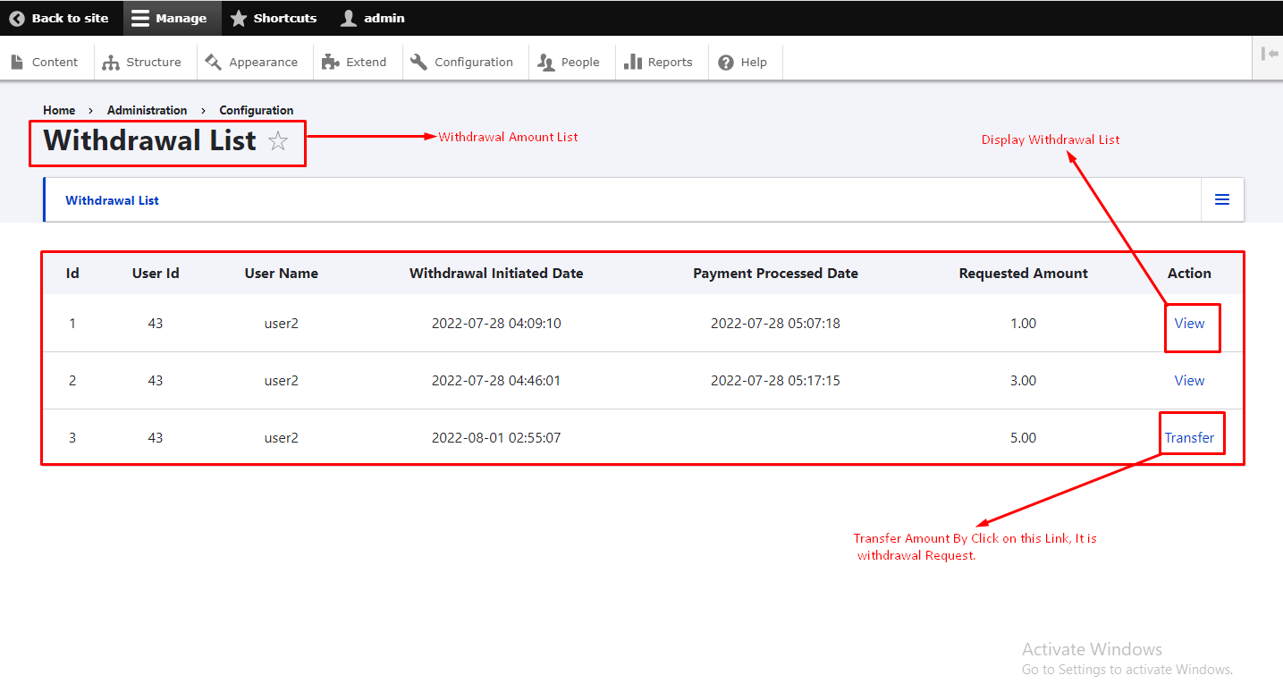 Go to Unilevel > Withdrawals List :- Here you will see user withdrawal requests list with view and transfer Action in below figure.