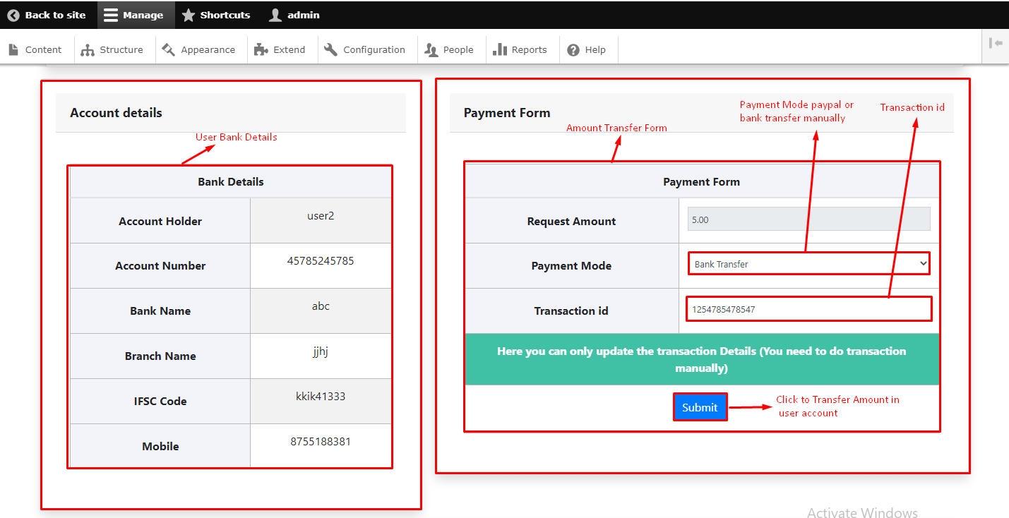 - transfer the witdrawal request amount by click on action transfer Link, here you will see the user's witdrawal requset and withdrawal history and bank details of users and transfer the amount